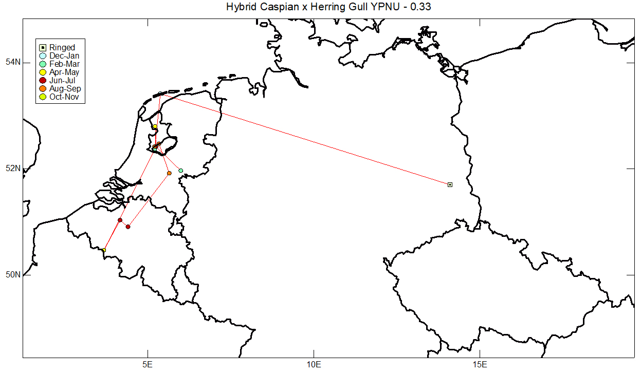 Caspian Gull cachinnans hybrid 0.33 (was XPNU), 2CY-7CY, 2021-2026, the Netherlands. Picture: Theo Ruppert, Eric Roeland, Thijs Horst & Mars Muusse.