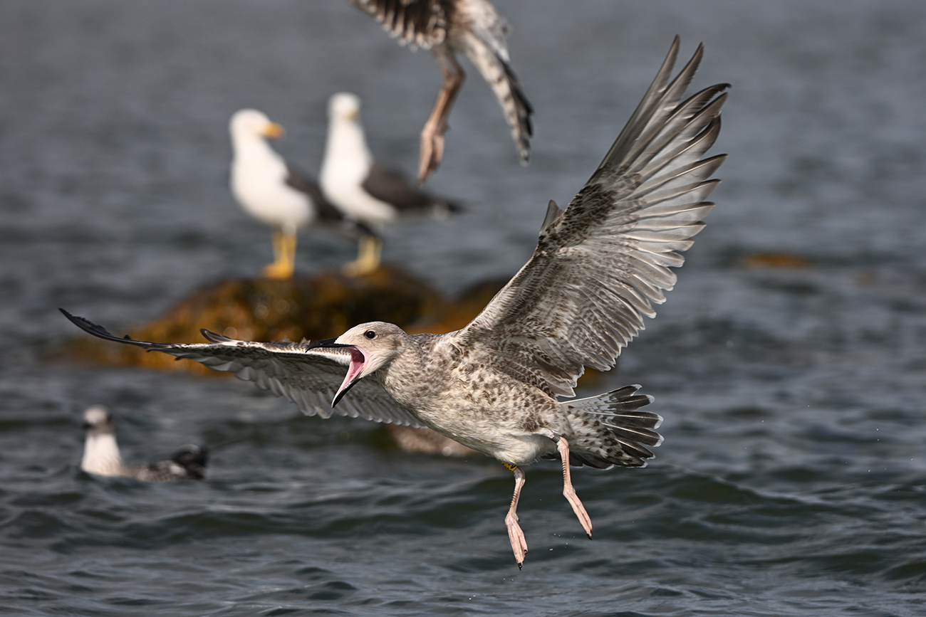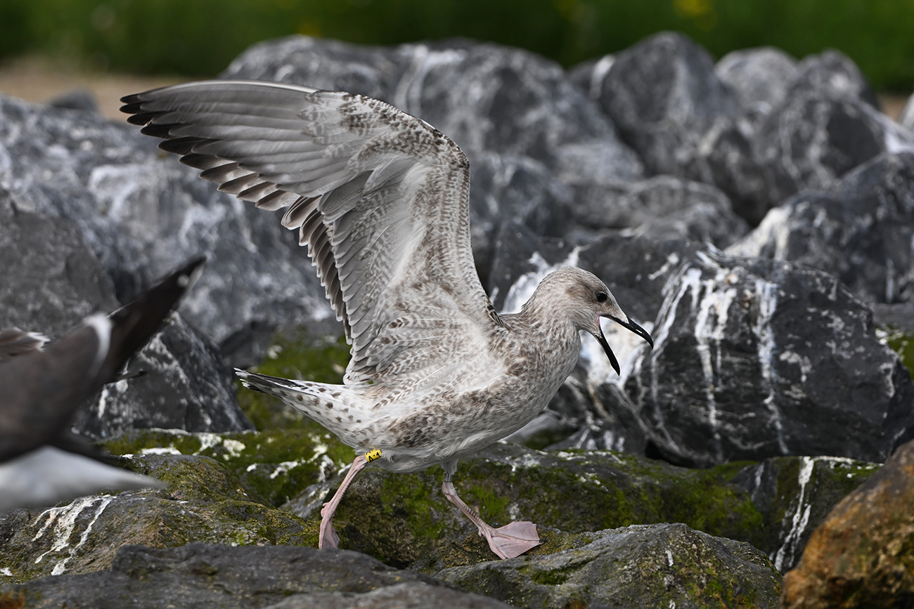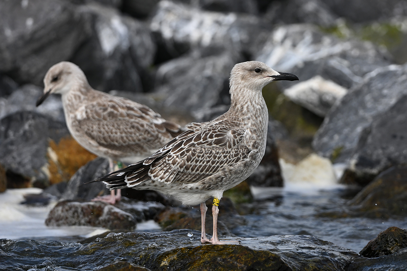 below: Caspian Gull cachinnans A:1 1CY, July 18 2025, colony De Kreupel, the Netherlands. Picture: Thijs Horst & Mars Muusse.