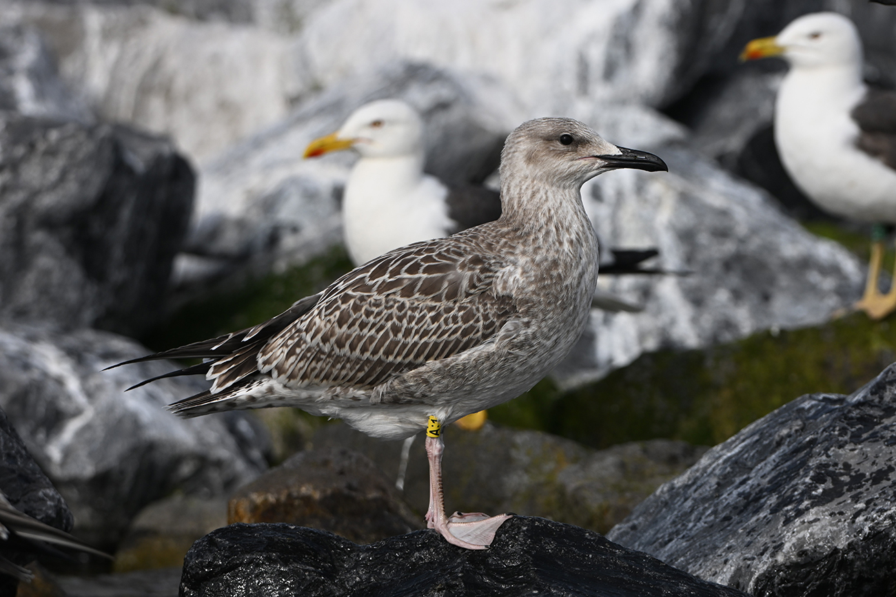 Tibia Y-A:1 and metal 5.632.613, ringed as pullus Larus cachinnans on May 09 2025 at IJsselmeer (De Kreupel), Noord-Holland, by ringer Leon Kelder.