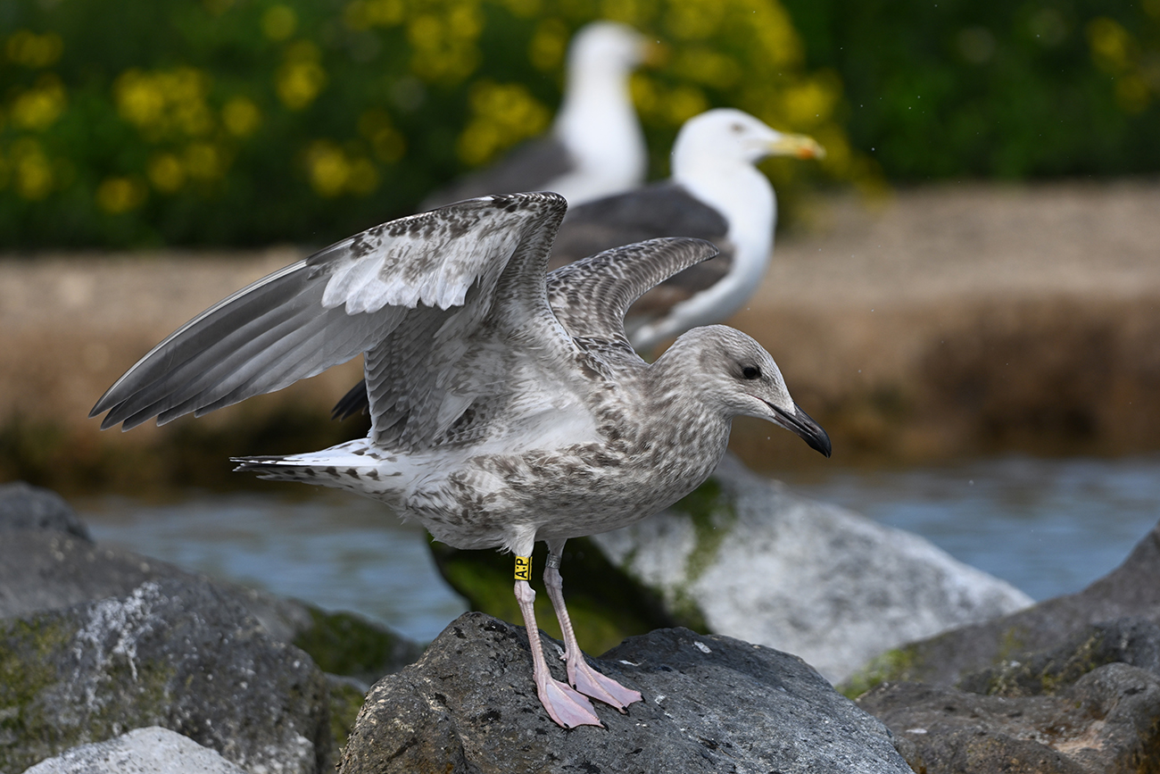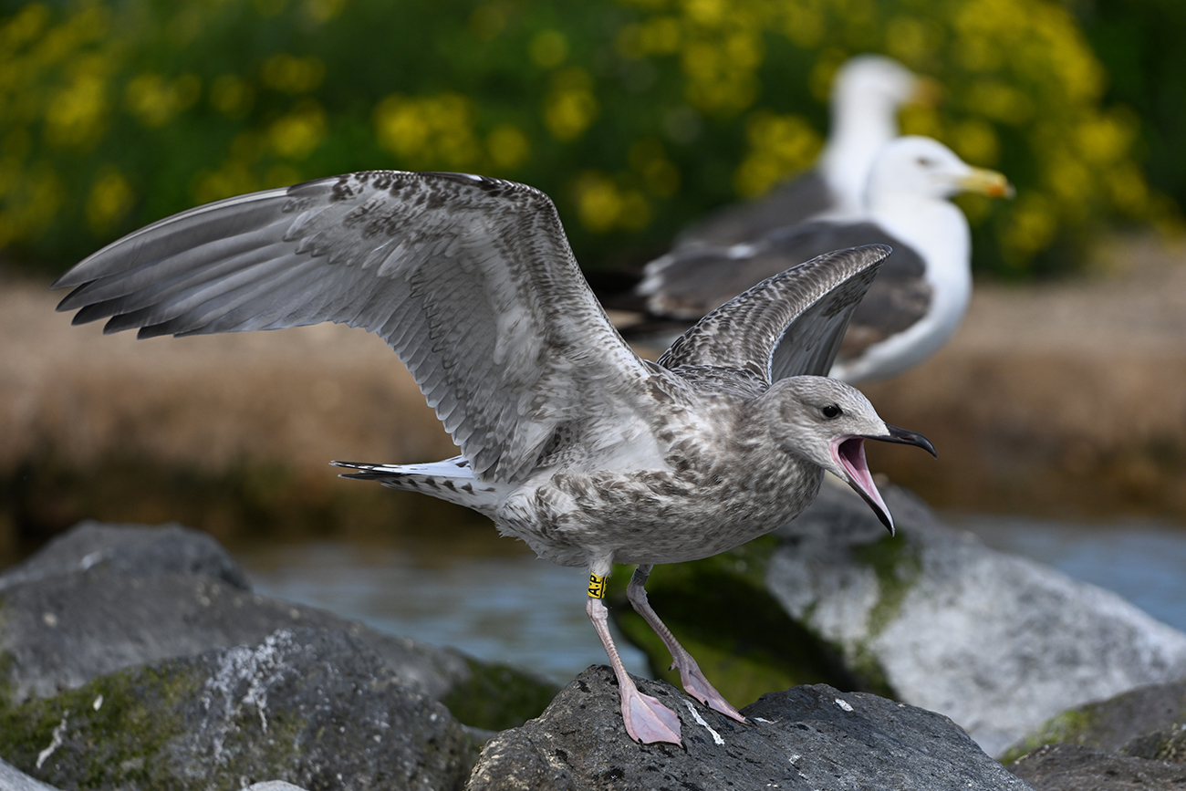 Tibia Y-A:P and metal 5.632.637, ringed as pullus Larus cachinnans on May 16 2025 at IJsselmeer (De Kreupel), Noord-Holland, by ringer Leon Kelder.
