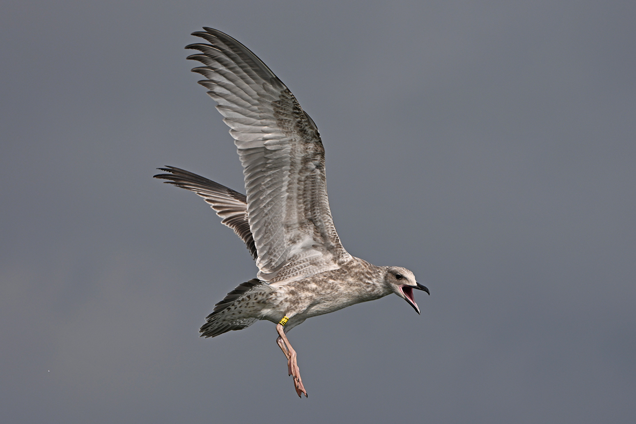 Tibia Y-B:3 and metal 5.633.702, ringed as pullus Larus cachinnans on May 16 2025 at IJsselmeer (De Kreupel), Noord-Holland, by ringer Leon Kelder.