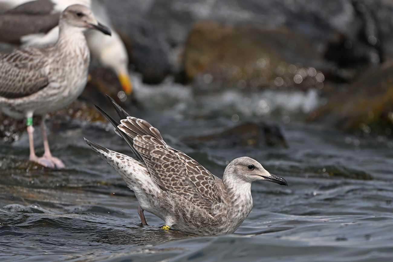 below: Caspian Gull cachinnans B:3 1CY, July 13 2025, colony De Kreupel, the Netherlands. Picture: Thijs Horst & Mars Muusse.