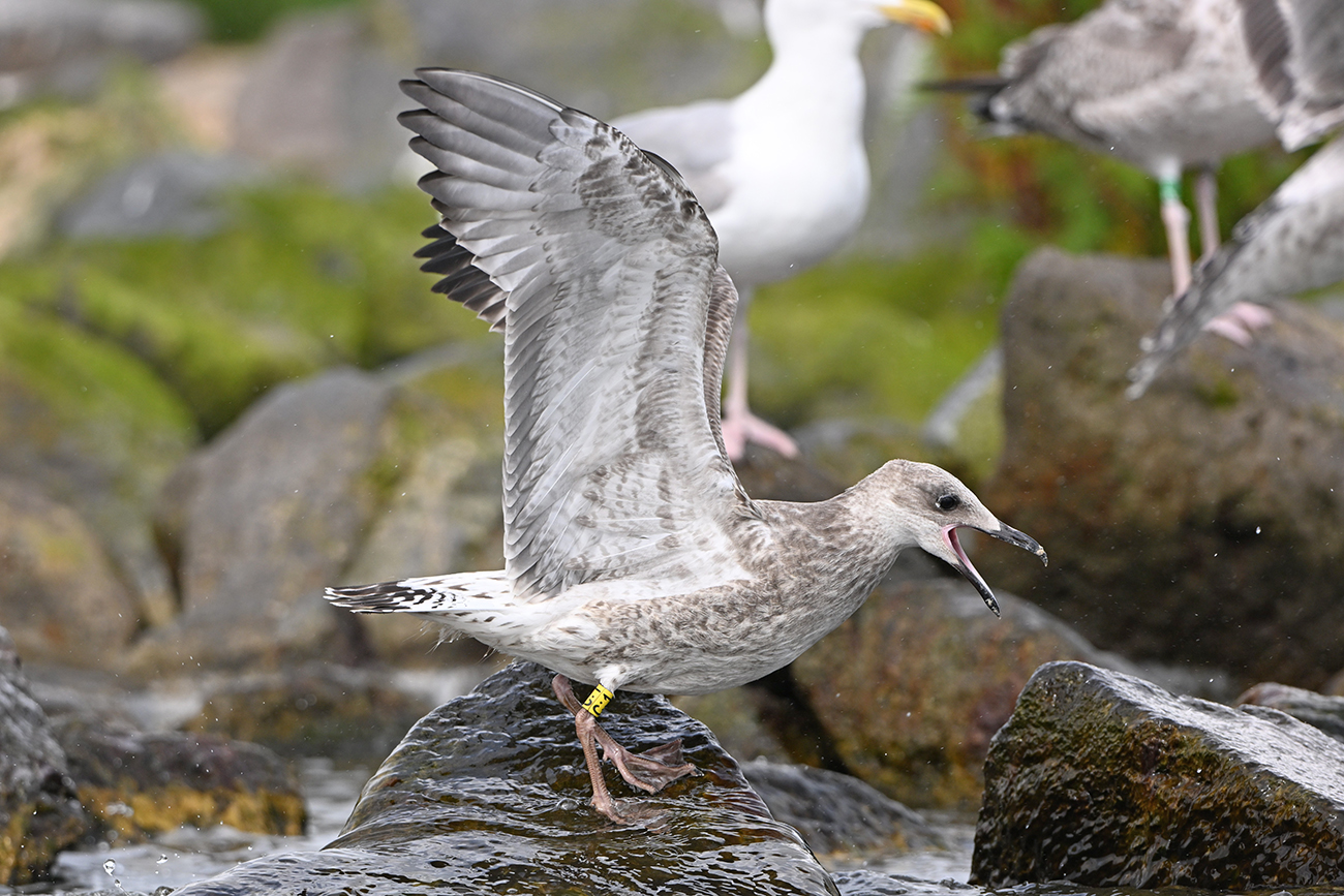 below: Caspian Gull cachinnans C:1 1CY, July 13 2025, colony De Kreupel, the Netherlands. Picture: Thijs Horst & Mars Muusse.
