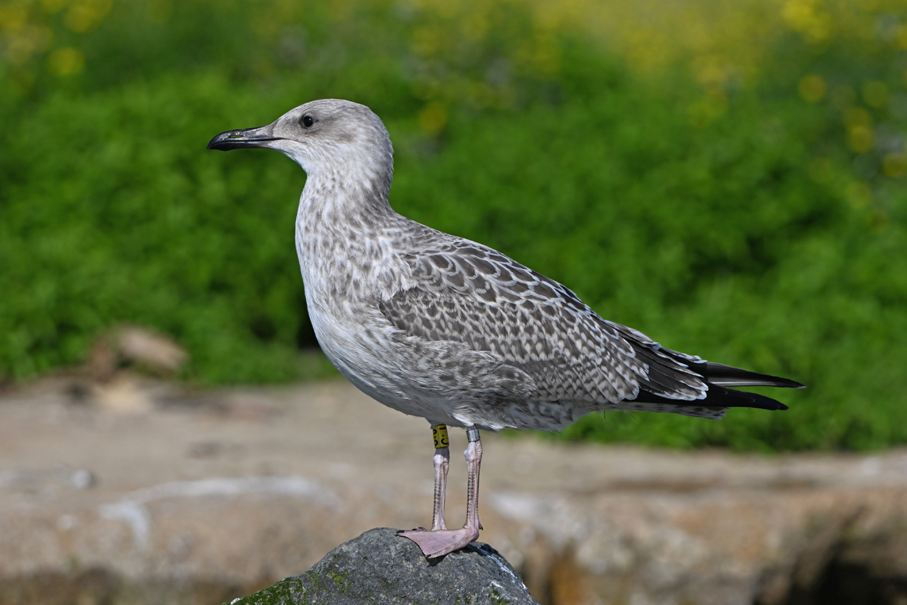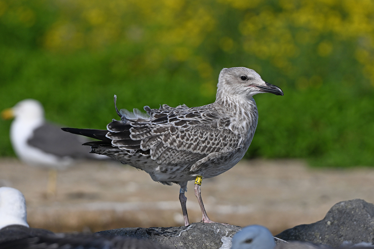 Tibia Y-C:J and metal Arnhem NLA 5.633.756, ringed as pullus Larus cachinnans on May 16 2025 at IJsselmeer (De Kreupel), Holland (5247.00 N 513.00 E), by ringer Leon Kelder.