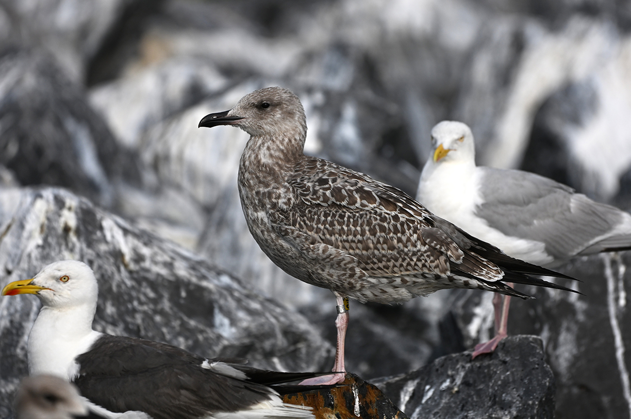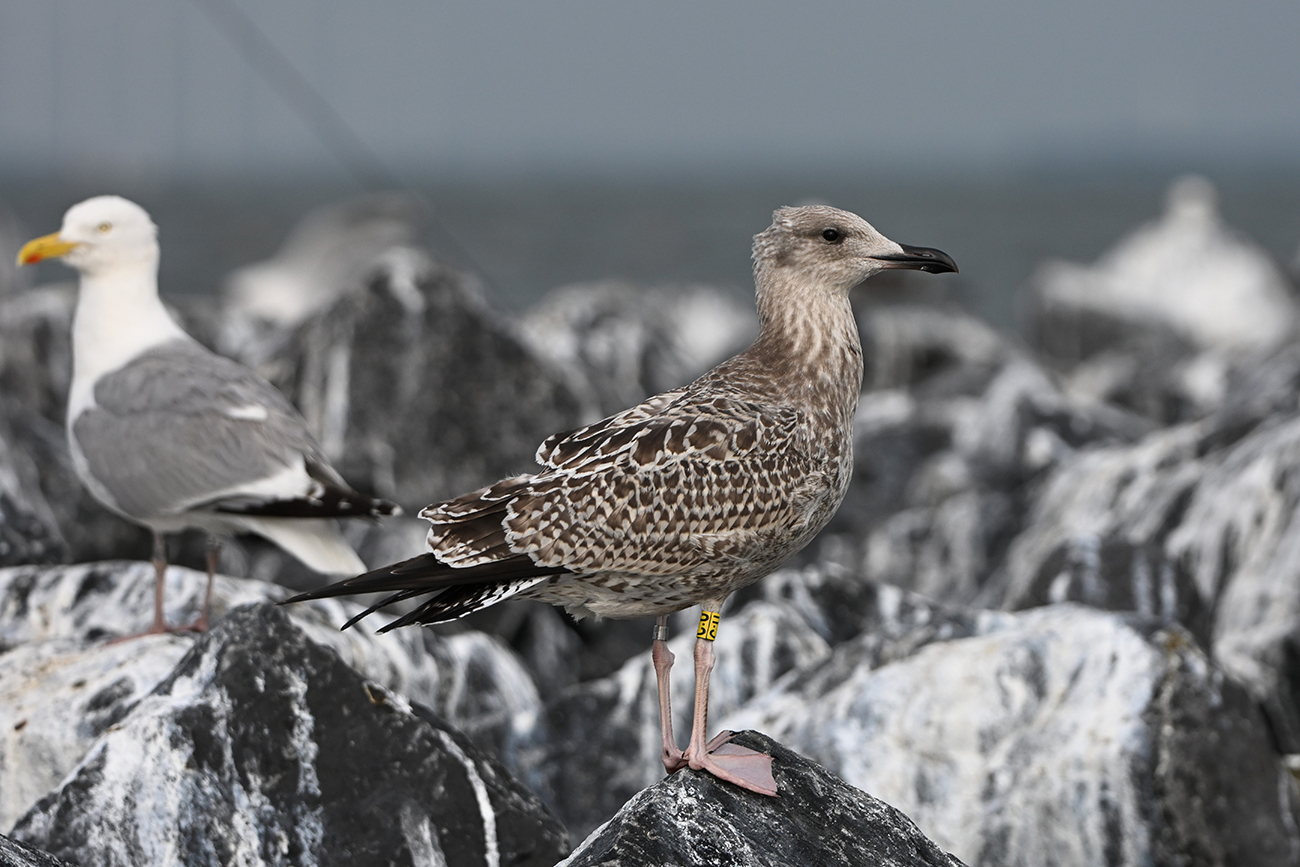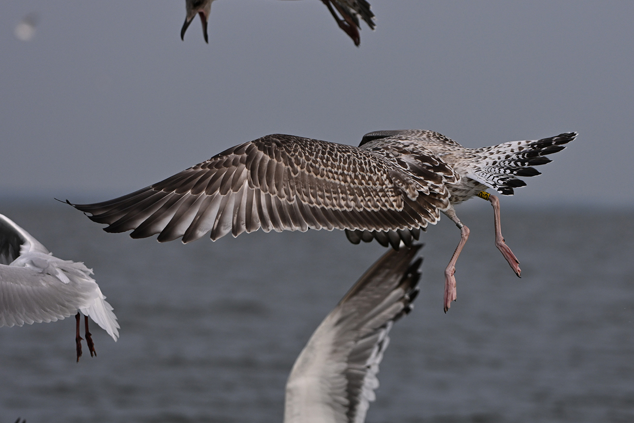 below: Caspian Gull cachinnans hybrid C:U 1CY, July 13 2025, colony De Kreupel, the Netherlands. Picture: Thijs Horst & Mars Muusse.