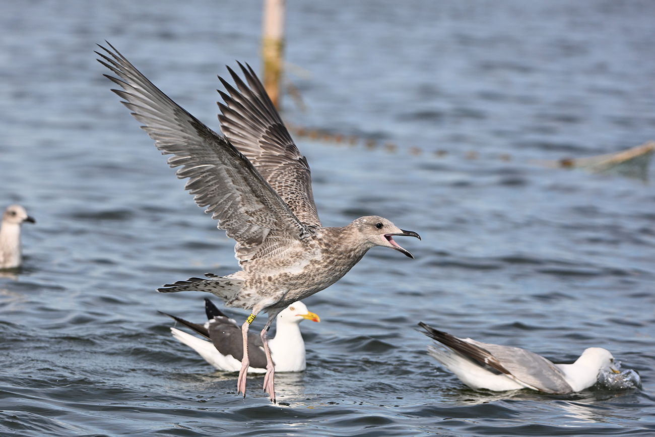 Tibia Y-C:U and metal 5.633.765, ringed as pullus F1-hybrid Larus argentatus x L. cachinnans on May 16 2025 at IJsselmeer (De Kreupel), Noord-Holland, by ringer Leon Kelder.