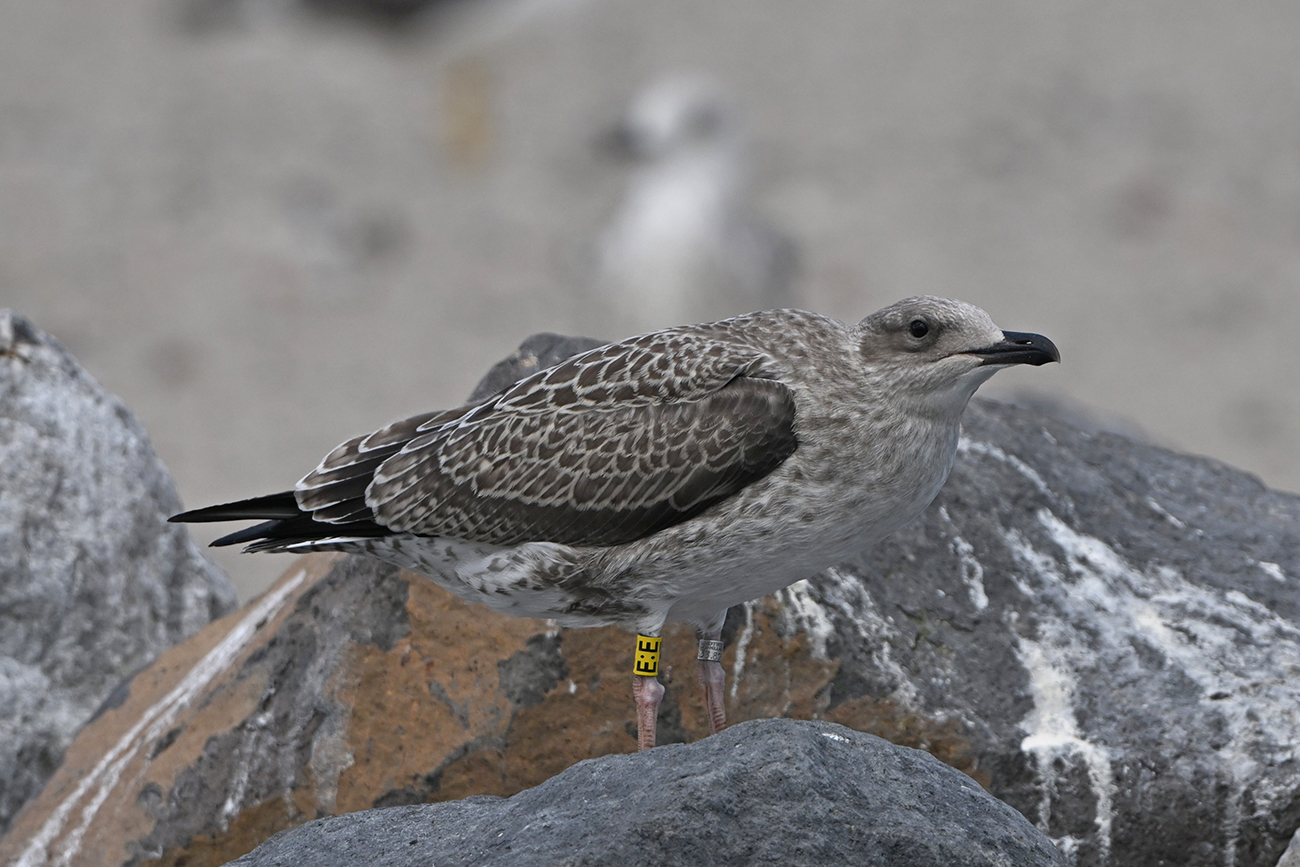 Tibia Y-E:E and metal NLA 5.633.829, ringed as pullus Larus cachinnans on May 30 2025 at IJsselmeer (De Kreupel), Noord-Holland, by ringer Leon Kelder.
