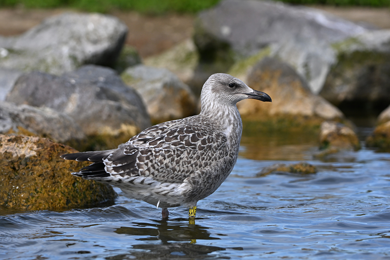 Tibia Y-E:L and metal Arnhem NLA 5.633.835, ringed as pullus Larus argentatus on May 30 2025 at IJsselmeer (De Kreupel), Holland (5247.00 N 513.00 E), by ringer Leon Kelder.