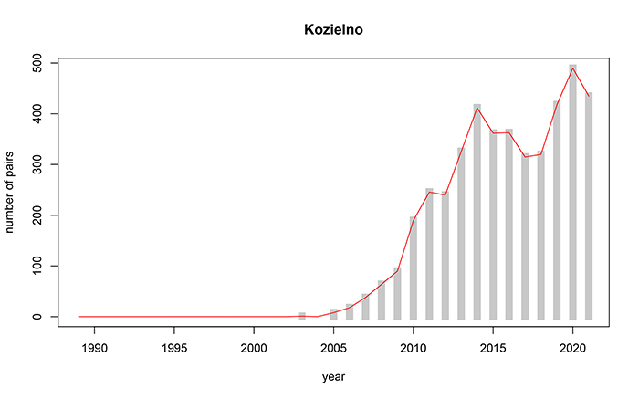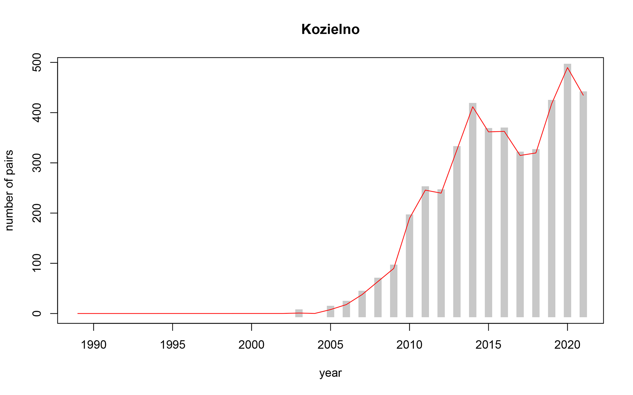 Ringing at Kozielno took place mostly in the period 2012-2017, and another rininging session in 2019, but nowadays we only monitor the place and count breeding pairs. Hence, no data on ringed or fledged juveniles, but the plan is to measure such parameters from next year on.