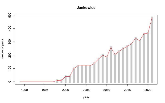 First breeding pairs at Jankowice occurred in 1998. Since this time the number has been rising. There were also some pairs of Yellow-legged Gulls (pure and mixed ones), including a female ringed as a chick in Italy, which bred at Jankowice in 2004 with Caspian Gull female.