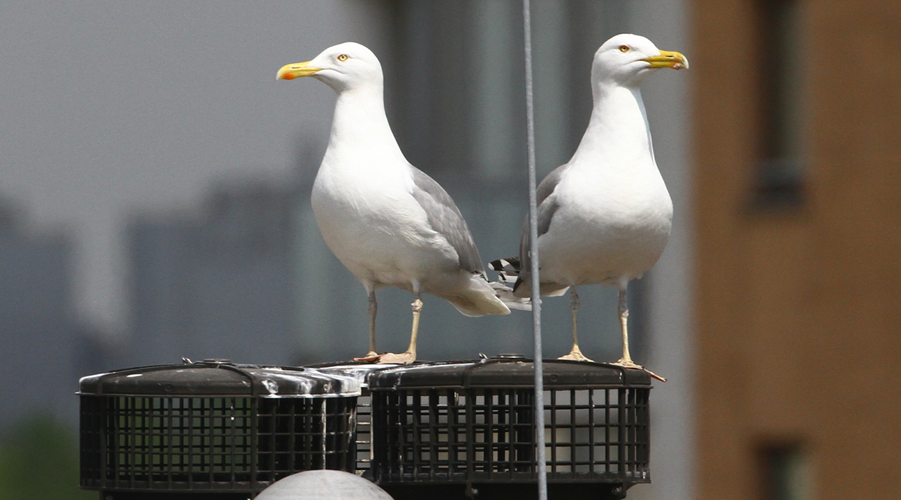 Herring Gull argentatus adult, May 14 2021, Warszawa-Mokotów, Poland. Picture: Jan Rapczyński.Breeding pair from the rooftop colony. Exact species of righthand bird difficult without image of the open wing showing details on pattern (from this perspective resembles Yellow-legged Gull). |