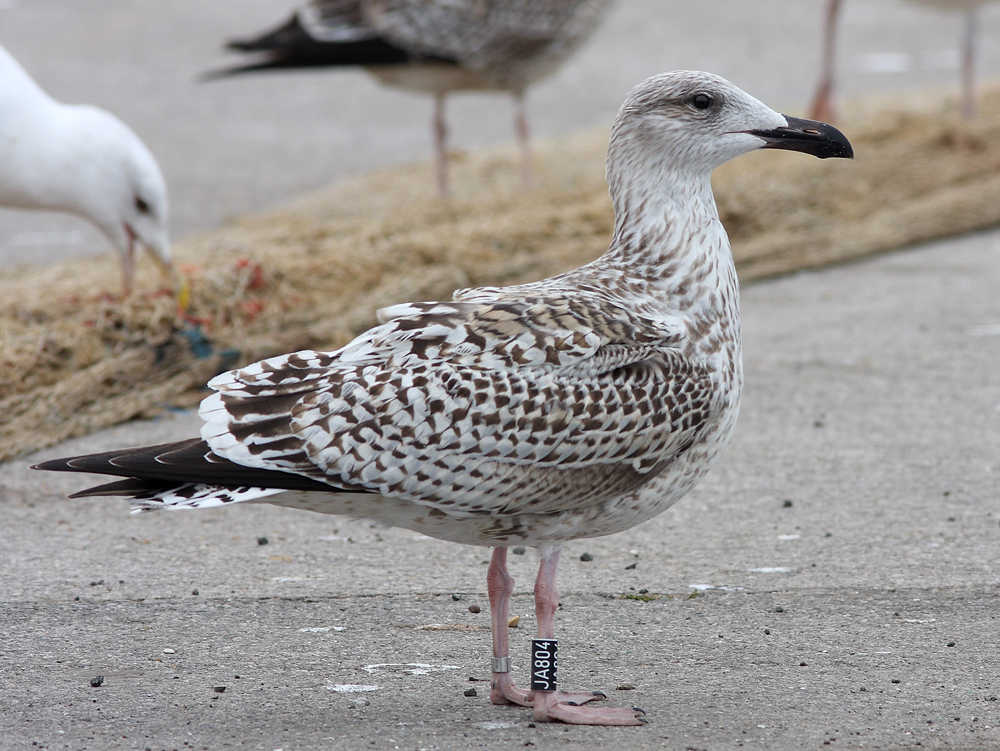 Great Black-backed Gull (marinus) 1cy JA804 September 28 2012, Boulogne-sur-Mer, NW France. Picture: Jean-Michel Sauvage.Ringed as pullus on 12 June 2012 at Salvøy, Karmøy, Rogaland, Norway (59°17'54"N 005°12'27"E). History: Several scapulars replaced for 2nd gen. Tertials and coverts juvenile. |