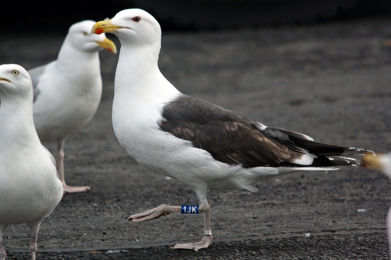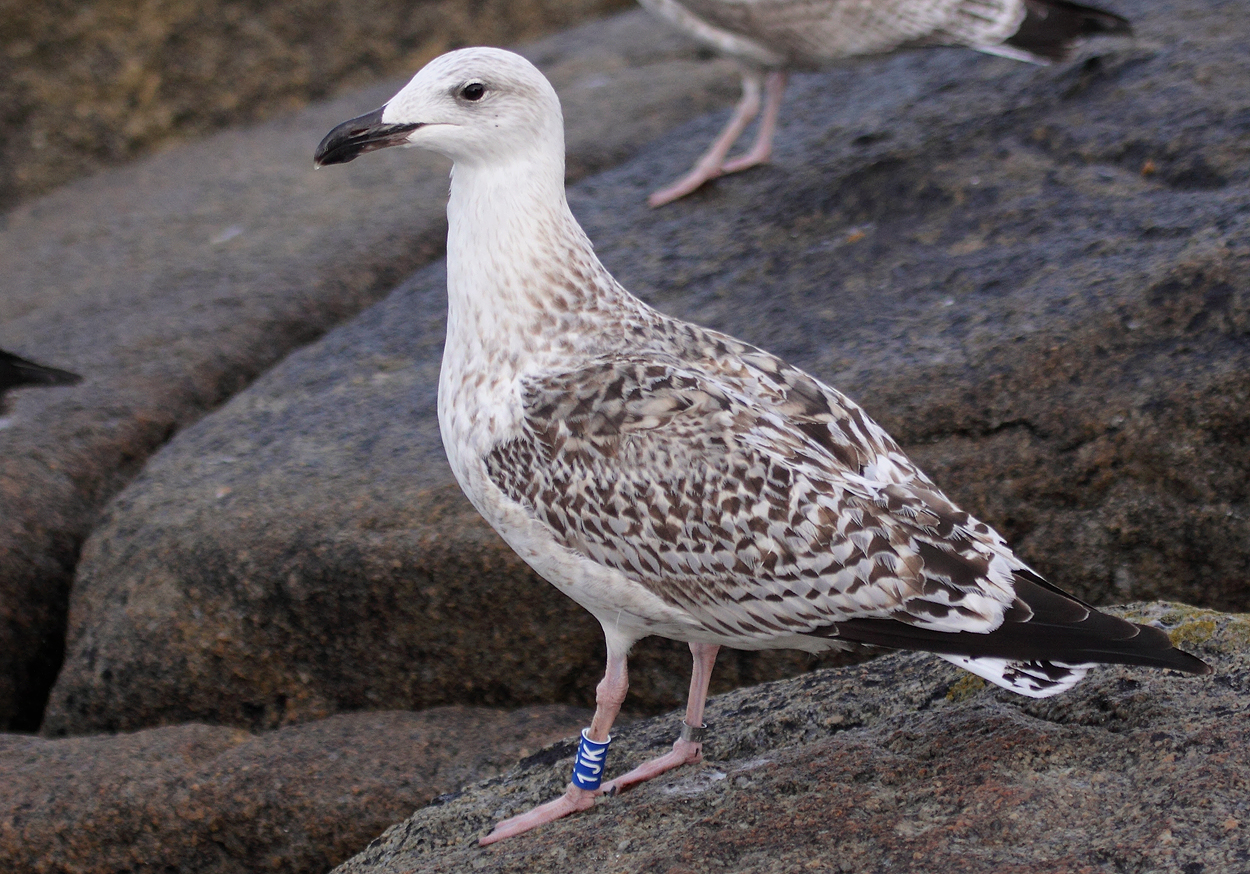 Great Black-backed Gull (Larus marinus) 1JK 1CY, 4CY & 5CY, November 2011, June 2014 & March 2015, near Dublin, Ireland. Picture: Stephen Lawlor & Graham Prole.Visit Stephen's Flickt photostream! Visit Graham's blog! Ringed on island Irelands Eye, near Dublin, summer 2011. below: Great Black-backed Gull (Larus marinus) 1JK 1CY, November 12 2011, Dalkey, Dublin, Ireland. Picture: Stephen Lawlor. Most upper scapulars replaced, coverts and tertials still juvenile. below: Great Black-backed Gull (Larus marinus) 1JK 4CY, June 07 2014, Howth, Ireland. Picture: Graham Prole. No black on the bill. below: Great Black-backed Gull (Larus marinus) 1JK 5CY, March 14 2015, Howth, Ireland. Picture: Graham Prole. P1-P10 old. below: island Irelands Eye, near Dublin. |