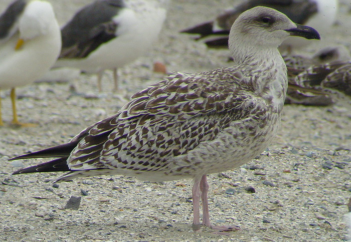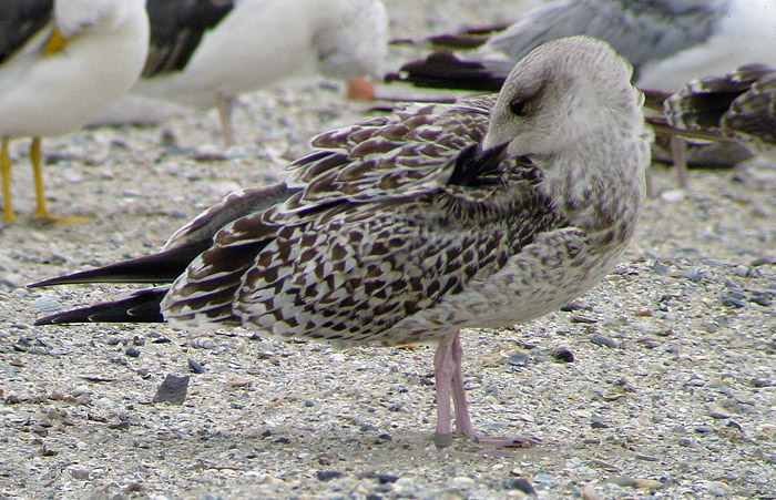 Great Black-backed Gull 1cy (Larus marinus) DKC 3069450 August 22 2003, IJmuiden the Netherlands.Ringed as pullus on May 27 2003 in Saltholm, Tarnby, Denmark (55.38N 12.46E). A Danish individual in juvenile plumage, with a few scapulars replaced for second generation feathers. |