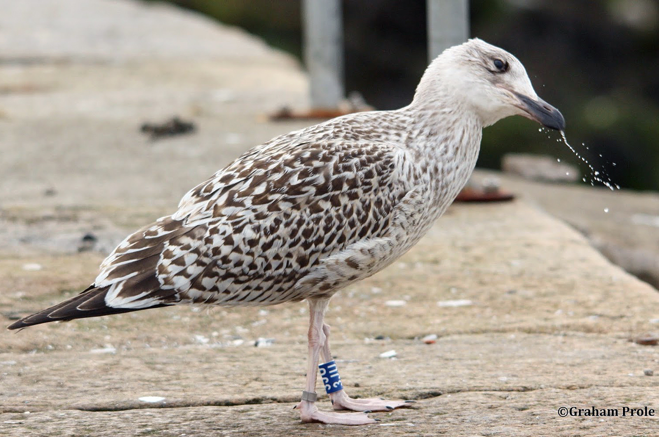 Great Black-backed Gull (Larus marinus) 3JU 1CY, September 20 2015 , Howth, Ireland. Picture: Graham Prole.Visit Graham's blog! Ringed on island Irelands Eye, near Dublin, summer 2015. All scapulars still juvenile. below: island Irelands Eye, near Dublin. |