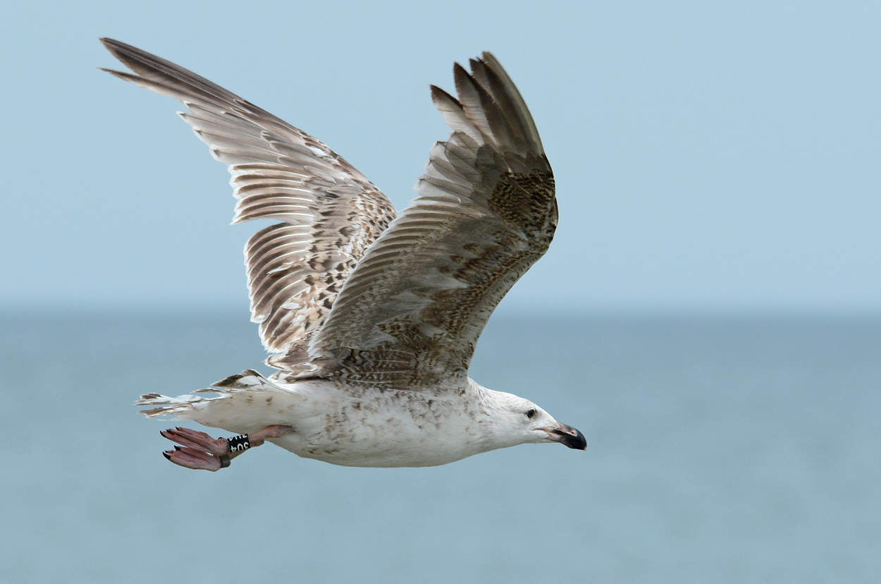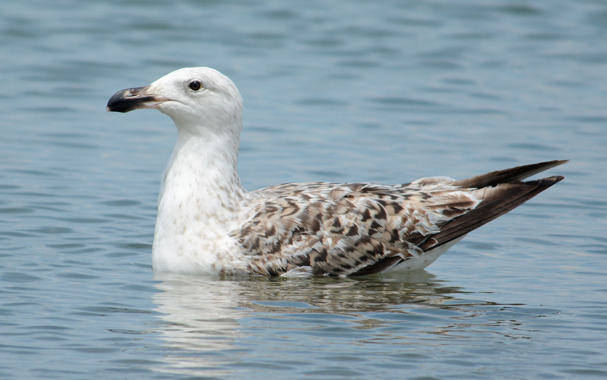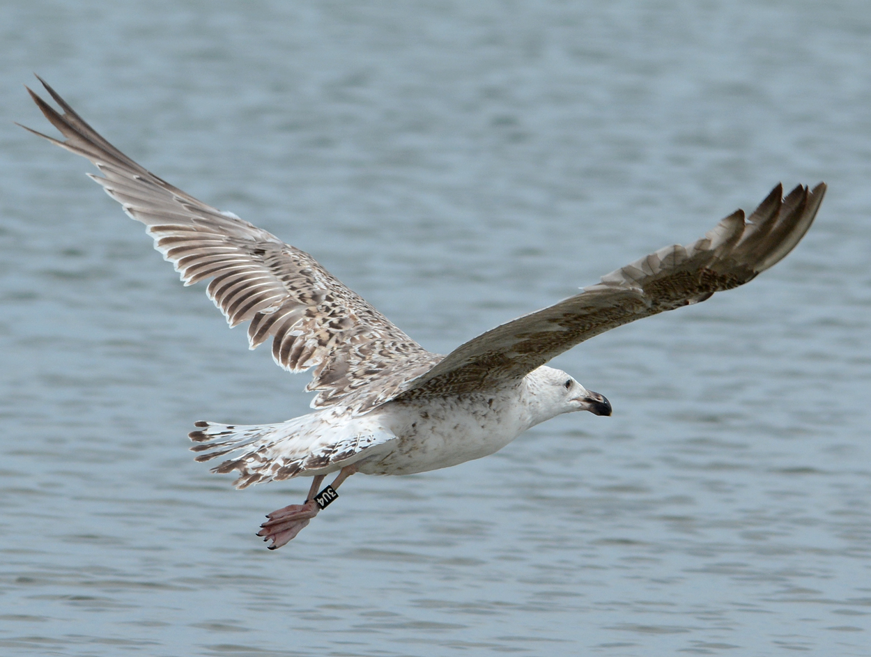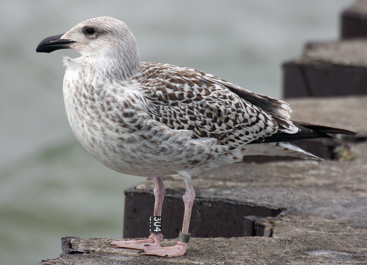 Great Black-backed Gull (Larus marinus) 3U4 September 2013 & May 2014, New York & Whiting. Picture: Brad Carlson & Amar Ayyash.Banded as pullus on Appledore Island, July 2013. A resighting in September 2013 was reported from Rochester, New York (Lake Ontario), then about 1,000 miles from where it hatched, this 1st summer bird will likely remain on southern Lake Michigan for the rest of the summer season. It will be interesting to see if it returns in subsequent years. Very intriguing is that the Hamilton Lake Watch near Rochester reports that Great Black-backeds are almost always seen migrating "westbound" in late Fall. Perhaps the increasing Lake Michigan winter population is one that exhibits an east-west migration, and doesn't originate from as far north as thought by some. below: Larus marinus 3U4 1st cycle (1CY), September 01 2013, Summerville Pier - Rochester, New York. Picture: Brad Carlson.Visit Brad's Flickr photo's. Bird in completely juvenile plumage. Huge bill indicate male. below Larus marinus 3U4 moult into 2nd cycle (2CY), May 27 2014, Whiting, Indiana. Picture: Amar Ayyash.Visit Amar's blog. In complete moult: P1-P3 fully growng, P4-P5 growing, P6 missing, P7-P10 old in right wing and P7 fropped in left wing. Still all secondaries and rectrices old, worn and bleached juvenile feathers. Median coverts largely replaced, except MC3 which still seems to be growing; inner GC1-GC3 replaced, GC4-GC6 & GC8 still old juvenile (GC7 broken?), central greater coverts missing, exposing the dark centres of the juvenile secondaries underneath. LLC1 old, LLC2-LLC5 replaced 2nd gen, central lower lesser coverts missing, outermost visible LLC replaced and many missing. Few single LC replaced, especially in outer tract of LC, most lesser covert feathers worn juvenile. Fresh 3rd gen upper scaps again 2nd gen like patterned, anchor-shape. |