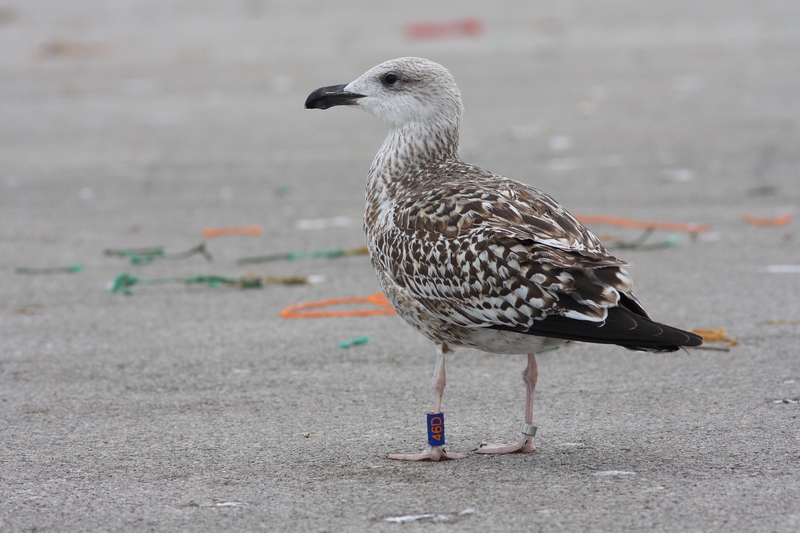 Great Black-backed Gull 1cy (Larus marinus) 46D November 05 2008, Boulogne sur Mer, France (50.44 N - 01.35 E). Picture Jean-Michel Sauvage.Female in juvenile plumage, with replaced upper scapulars. Ringed at Le Havres, Normandy, France at June 28 2008; born in the centre of the town. |