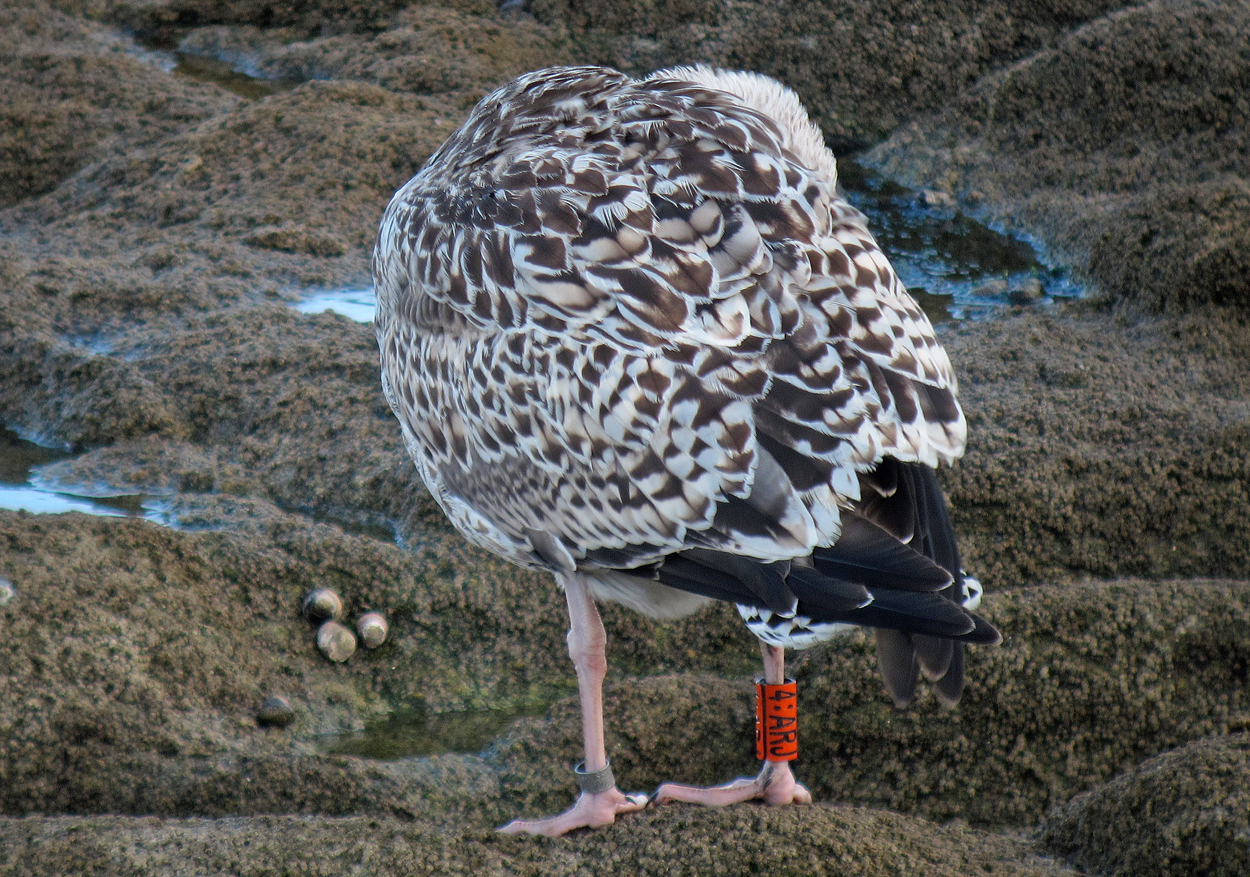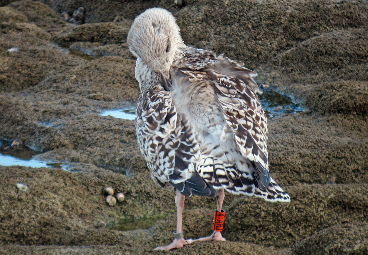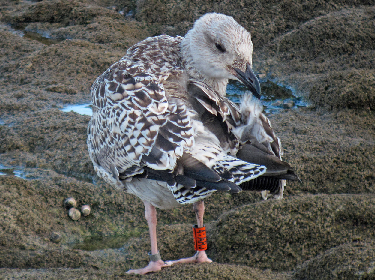 Great Black-backed Gull (Larus marinus) 4:ARJ 1CY, August 13 2014, La Turballe, France. Picture: Alain Fossé.See Alain's website please! Orange 4:ARJ, ringed as pullus on June 19 2014 at l'île d'Houat (56), France. Now at La Turballe (47°20'54.4"N 2°30'57.5"W) near Nantes. Interesting moult in scaps early in the season. And, is this bird missing some central median coverts?? US=1-25%, LS=1-25%, TOT SCAPS=1-25%. |