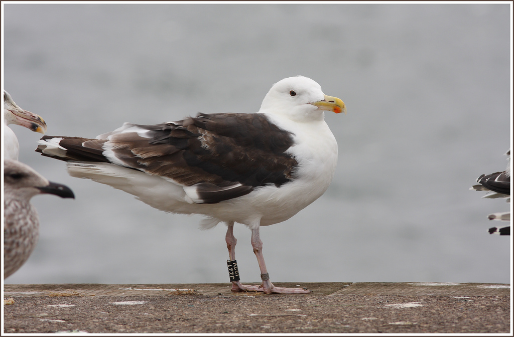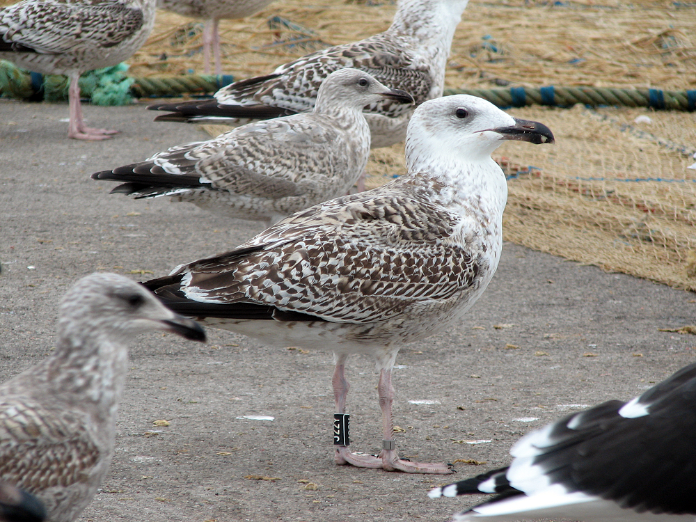 Great Black-backed Gull (Larus marinus) J22Y November 08 2007 & August 23 2010, Boulogne sur Mer, France (50.44 N - 01.35 E). Picture Jean-Michel Sauvage.Bird ringed as pullus on July 04 2007 at Sogne, Norway. below: J22Y 1cy: November 08 2007, Boulogne sur Mer. Upper scapulars 2nd gen, but wing-coverts and tertials still juvenile. below: J22Y 4cy: August 23 2010, Boulogne sur Mer. Complete moult halfway.