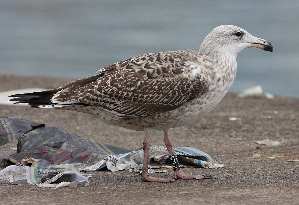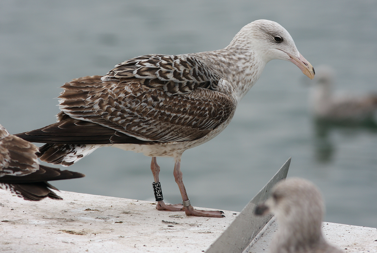 Great Black-backed Gull (Larus marinus) JP625 1-2cy: November 2012 & April 2013, Boulogne sur Mer, France. Picture Jean-Michel Sauvage.Ringed as pullus on 28 June 2012 at Flateskjær i Skjernøysund, Mandal, Vest-Agder, Norway (57°59'48"N 007°32'52"E). History: below: JP625 2cy, April 06 2013, Boulogne-sur-Mer, France. Picture Jean-Michel Sauvage. Less black on bill now and noice illustration to show extent of winter moult in scapulars between November and April. below: JP625 1cy, November 27 2012, Boulogne sur Mer, France. Picture Jean-Michel Sauvage. US: 75-99%, LS: 1-25%, TOT SCAPS: 50-75%. Coverts and tertials juvenile. Note pale bill base. |