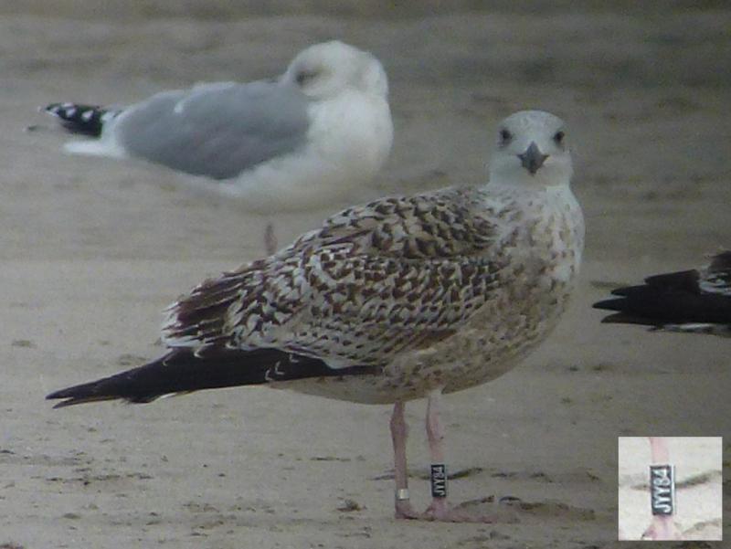 Great Black-backed Gull (Larus marinus) JYY84 1cy: November 23 2014, Ter Heijde, the Netherlands. Picture: Caroline Walta.Ringed as pullus on July 11 2014 in Kjølpen, Nordjylland, Denmark. US: 100%, LS: 75-99%, TOT SCAPS: 75-99%. Tertials and coverts juvenile. |