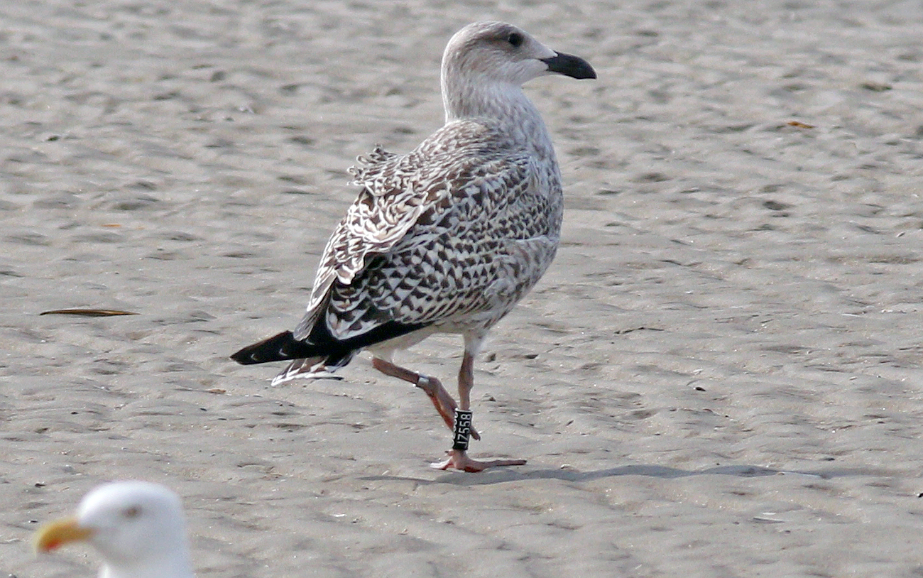Great Black-backed Gull (Larus marinus) JZ558 1CY, August 22 2015 , IJmuiden, the Netherlands.