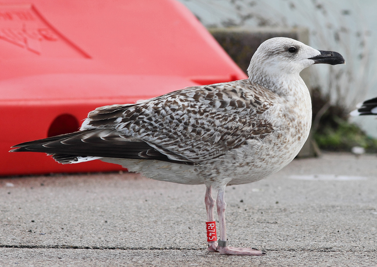 Great Black-backed Gull (Larus marinus) R745 1CY, November 07 2014, Boulogne-sur-Mer, France. Picture Jean-Michel Sauvage.Ringed as pullus on July 02 2014 at TURMANSÖREN, HÅLLNÄS, UPPLAND, SWEDEN (60º 37´N 17º 58´E). Distance: 1496 km. Observed on September 27 2014, and November 06-07 2014 at Boulogne-sur-Mer. Single feathers replaced in scapulars, otherwise juvenile plumage. |