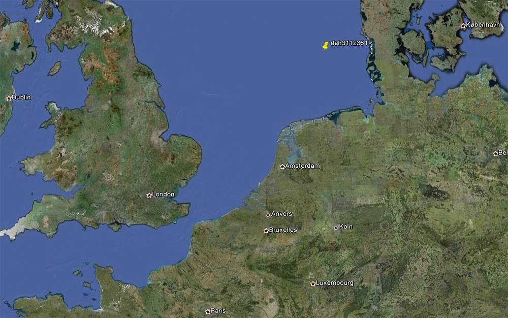 Bird of unknown origin; ringed on 17 September 2011 as 1cy by Andreas Buchheim, on board at ship "M/V Hydrograf" at "Ankerplatz 9" (+55°08'00,0''N +06°30'00,0'E') in the North Sea (see map below).
