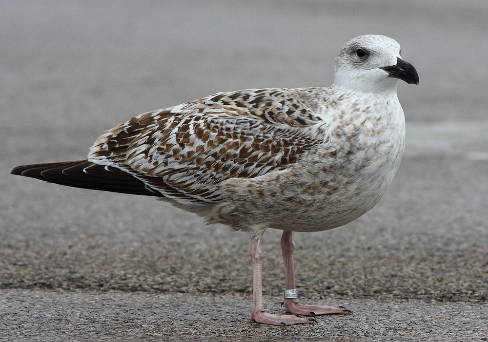 Great Black-backed Gull (Larus marinus) DKC 3M-0148 1cy: November 21 2012, Boulogne sur Mer, France. Picture Jean-Michel Sauvage.Bad weather, but a new bird for Jean-Michel. Ringed as pullus on June 29 2012 at Græsholm, Frederikshavn, Jylland, Denmark, by Kjeld Tommy Pedersen & Matthias Haupt. US: 75-99%, LS: 50-75%, TOT SCAPS: 50-75%. Coverts and tertials juvenile. |