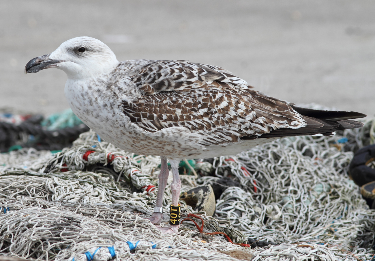 Great Black-backed Gull (Larus marinus) 40T 2CY, April 23 2016, Boulogne-sur-Mer, NW France. Picture: Jean-Michel Sauvage.Black 40T, ring data pending; probably ringed as pullus "goéland hurbain" in 2015 at Le Havre, Seine-Maritime, Normandy, France. Few scaps still juvenile. |