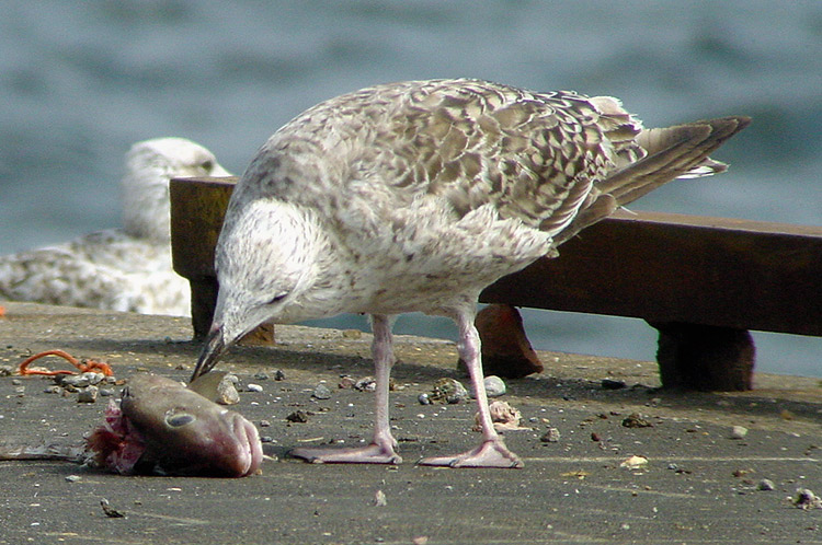 Great Black-backed Gull (Larus marinus) 2cy: June 23 2003, IJmuiden, the Netherlands (52.27 N - 04.33 E).An individual in active wing-covert moult. Many lesser coverts are missing, but some fresh second generation feathers are already visible. All median and lower lesser coverts have been replaced. The gap in the central greater covert row is obvious, exposing the juvenile secondaries underneath. The innermost greater coverts have been replaced, while the adjacent feathers are still juvenile. The complete central part of the row is missing, but from the outer wing, new greater coverts moult inwards. The upper two tertials are second generation as well, the third is growing and the juvenile lower tertials and innermost secondaries are just visible. This bird is moulting the rectrices, with the central tail-feathers growing / missing. Primary moult stage: P7-P10 still juvenile, P5 slightly longer than the fully grown P4. Recently moulted upper scapulars have buffish centres and show the same (second generation like) pattern as the white based lower scapulars. The soft parts are very immature with the bill mostly black.