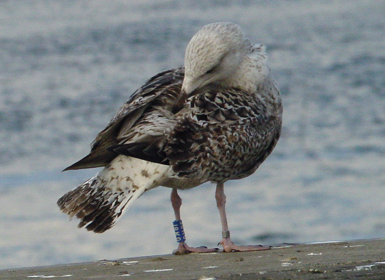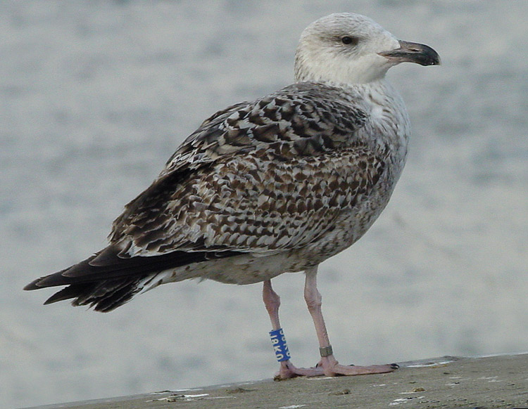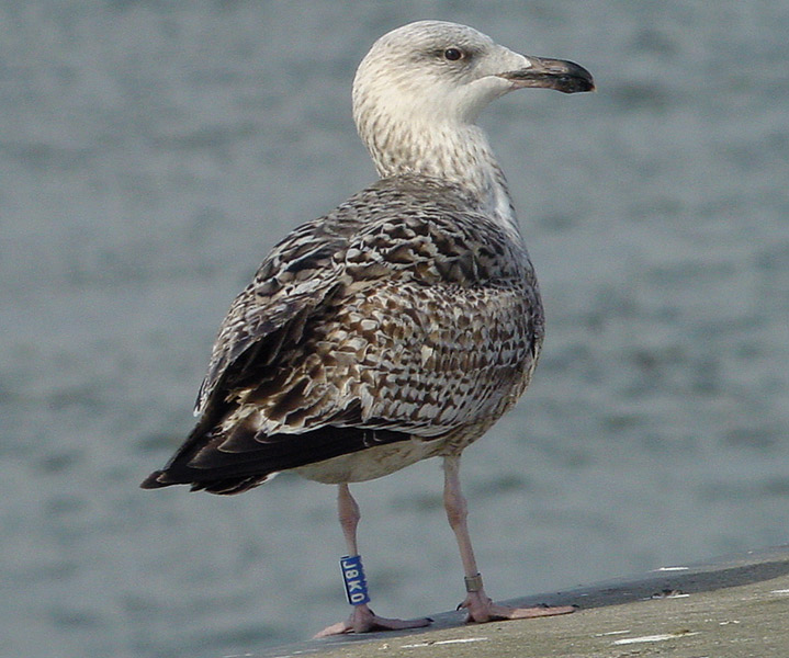 Great Black-backed Gull J8K0 (Larus marinus) 2cy: March 25 2004, IJmuiden, the Netherlands (52.27 N, 4.33 E).Ringed last summer in Vest-Agder, southern Norway. Juvenile coverts and tertials, remiges and rectrices. Almost all scapulars moulted to second generation. Note extensive black in tail. In general J8K0 is slightly darker than average. In case you find blue ringed Great Black-backed Gulls, you can send your information to: Lista Ringing Group, Box 171, 4558 Vanse, Norway or on e-mail clifu@c2i.net. CR-Code Dark blue ring with white code: