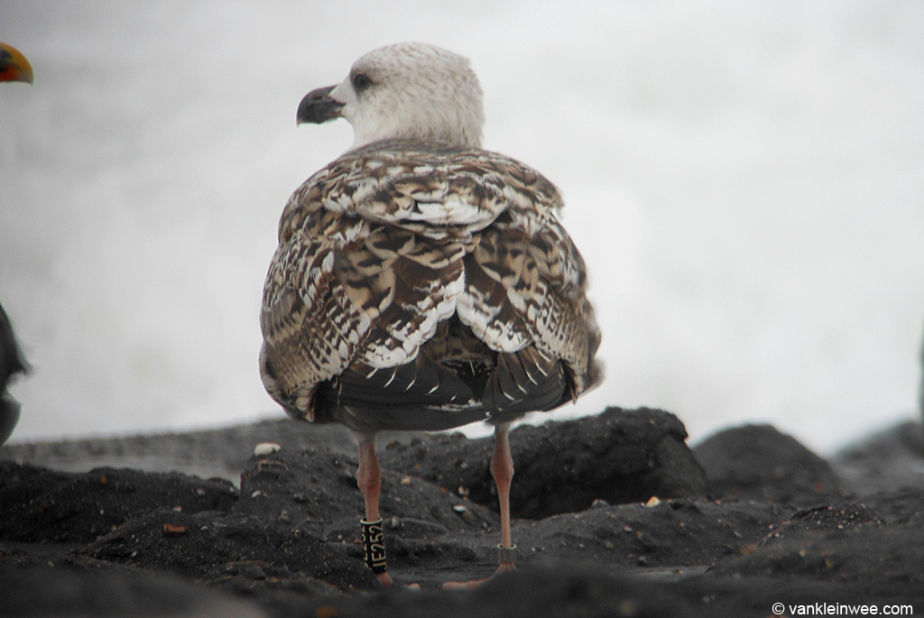 Great Black-backed Gull (Larus marinus) JE252 2cy, September 22 2011, Westkapelle, The Netherlands. Picture: Maarten van Kleinwee.Ring info: ringed as pullus on July 09 2010, ringed at Vest-Agder, Norway. P9 fully grown. Note start of partial autumn moult with again replacement of the upper tertials, inner gc and all the cental mc (ordinary sequence and feather pattern). |