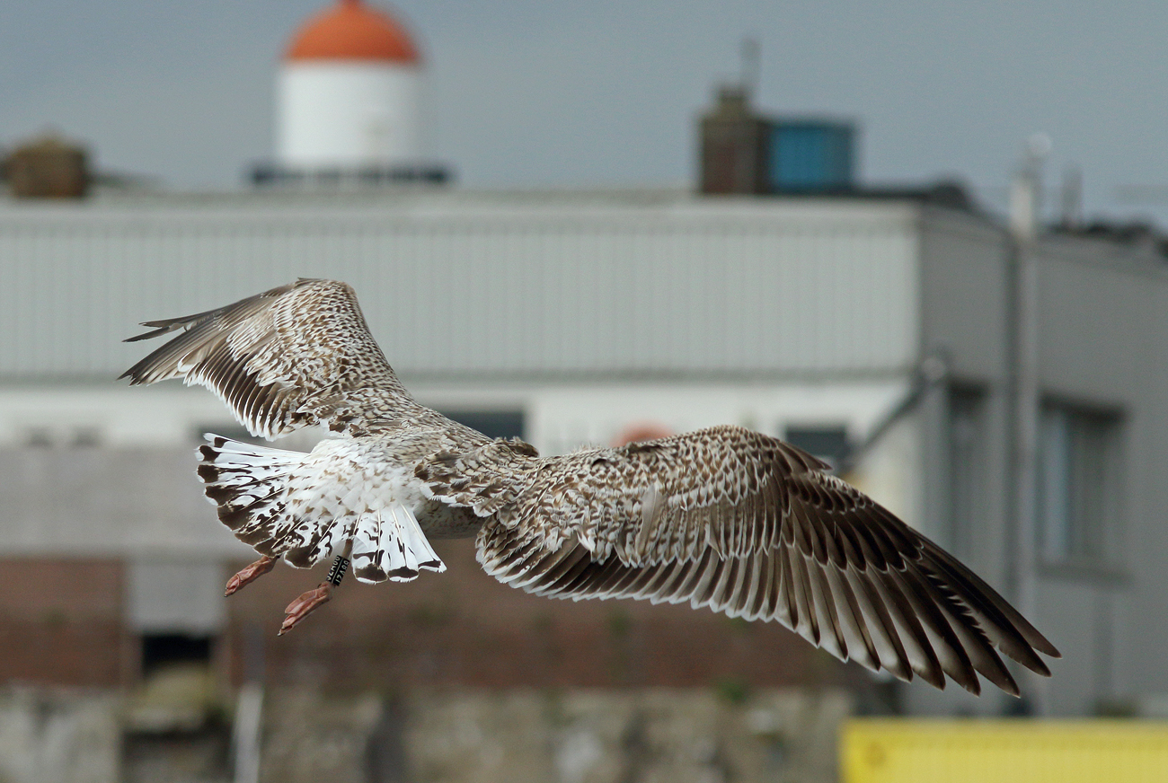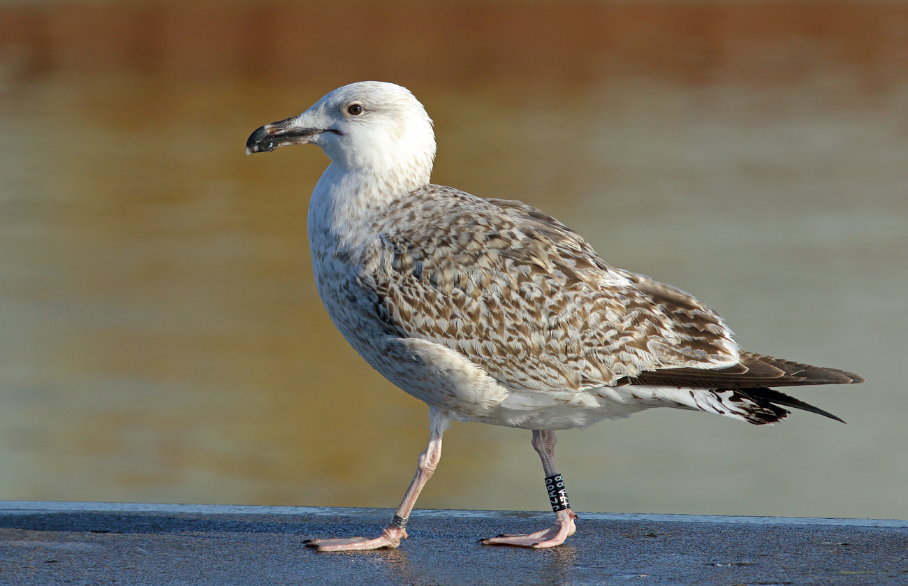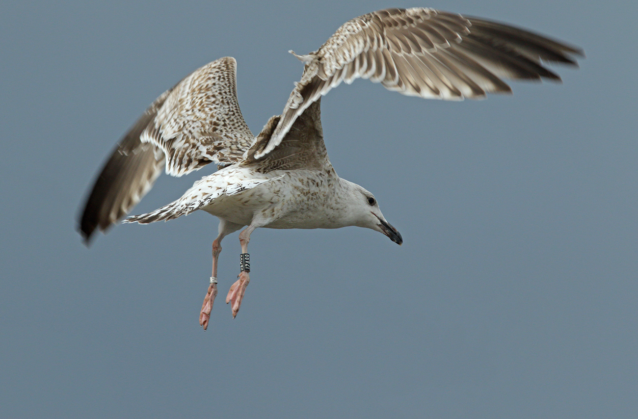 below: Great Black-backed Gull (Larus marinus) JZA88 1st cycle (2CY), March 06 2016, IJmuiden, the Netherlands.