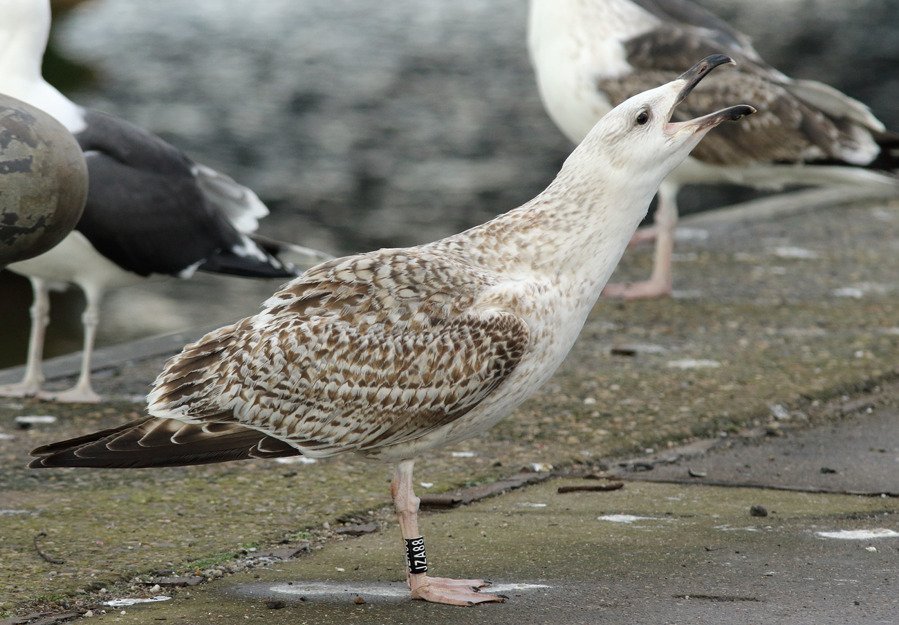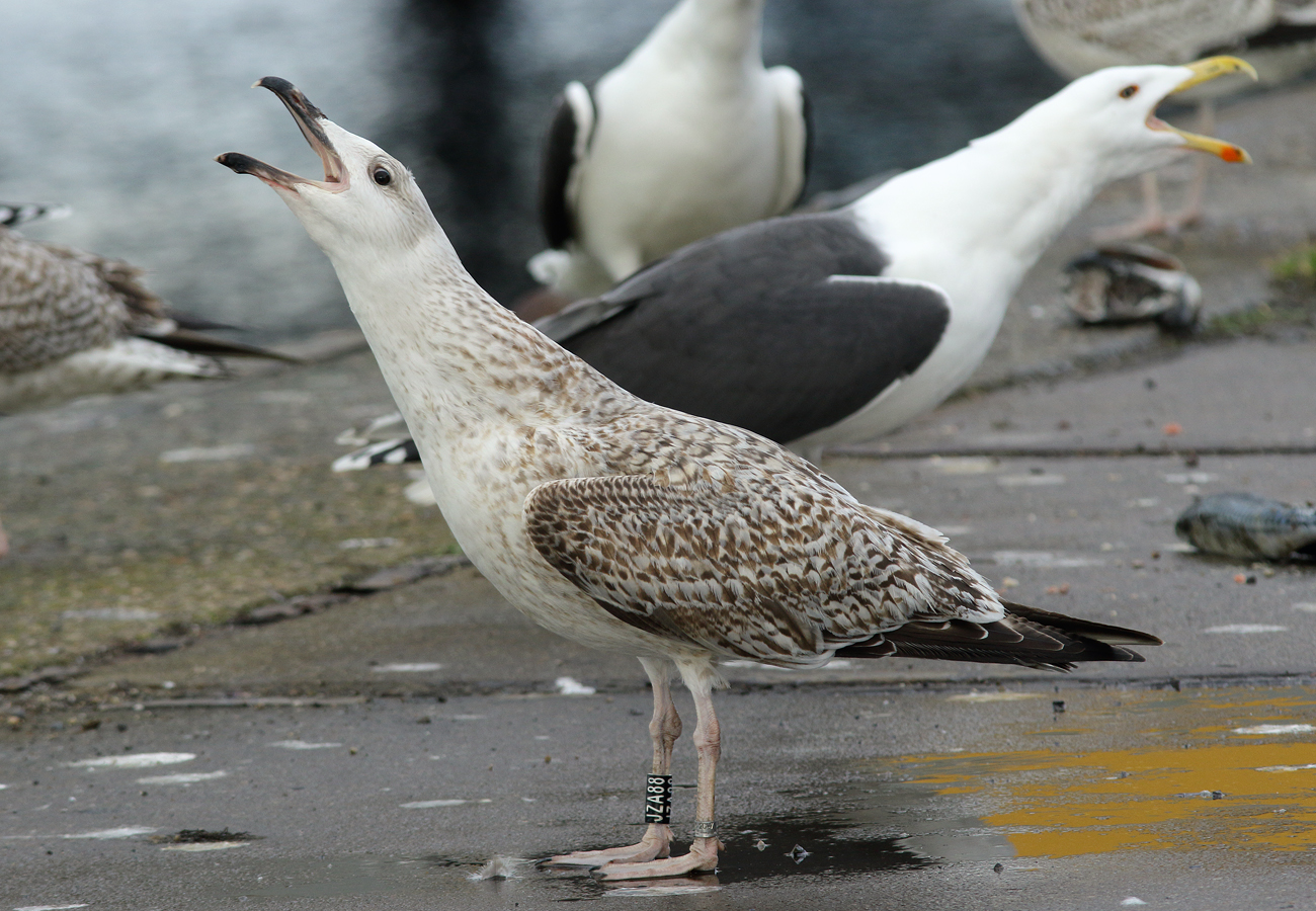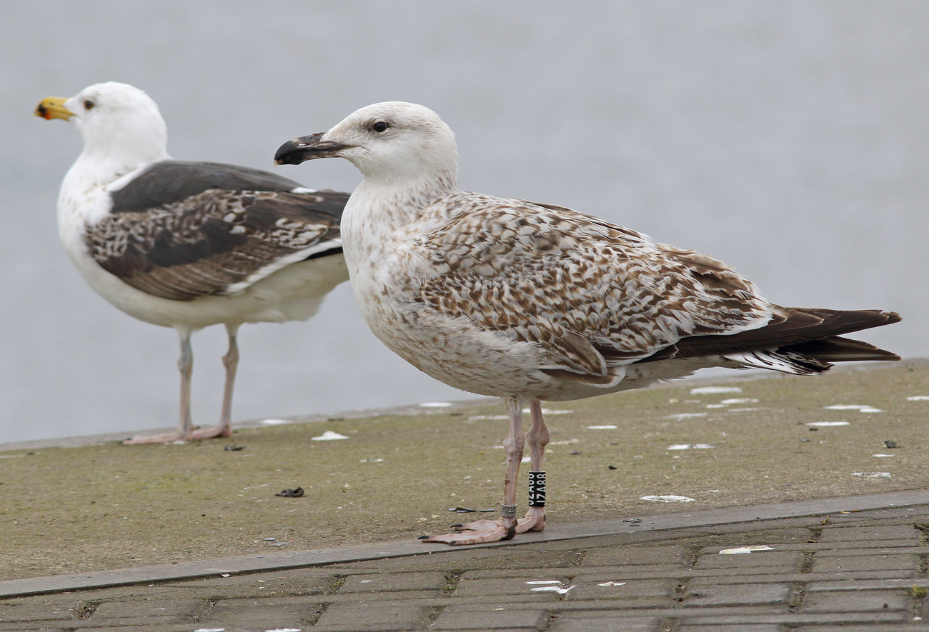 below: Great Black-backed Gull (Larus marinus) JZA88 1st cycle (2CY), March 21 2016, IJmuiden, the Netherlands.