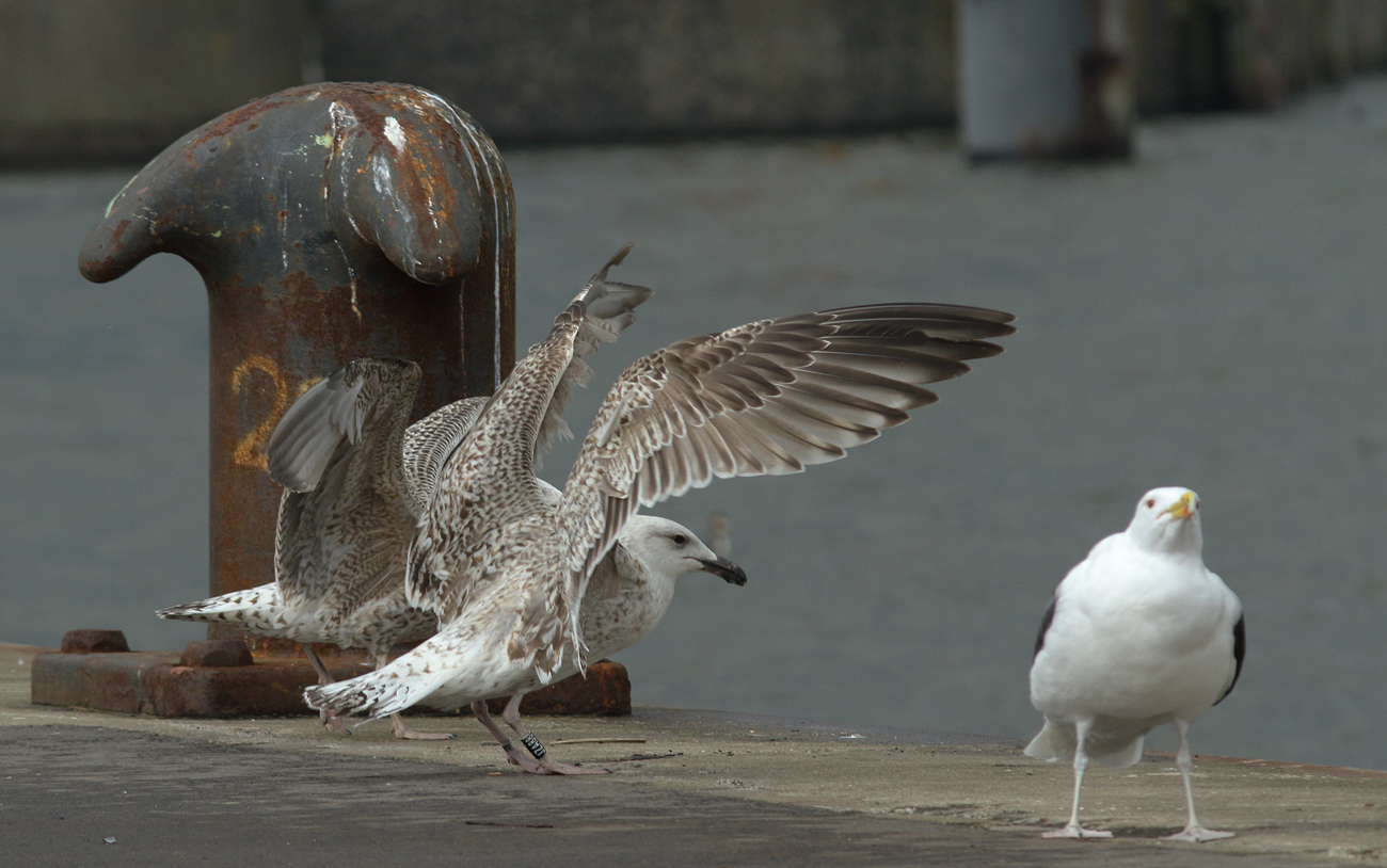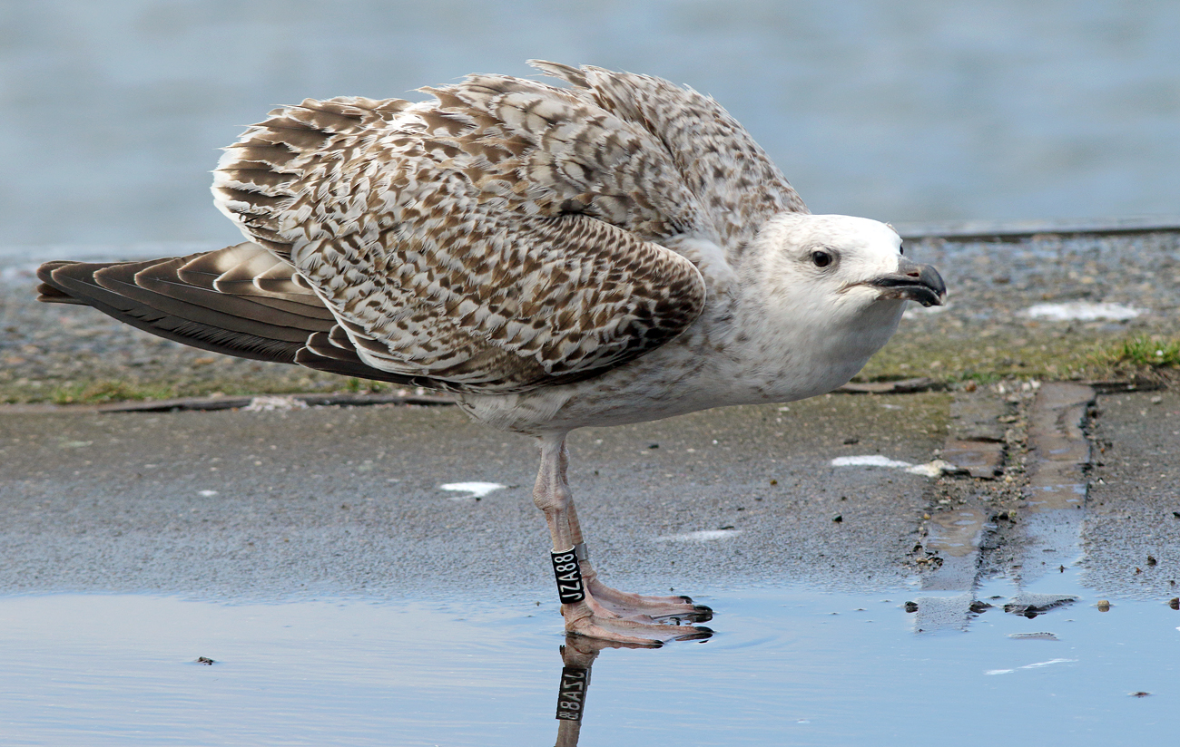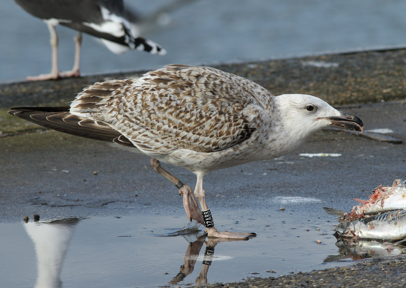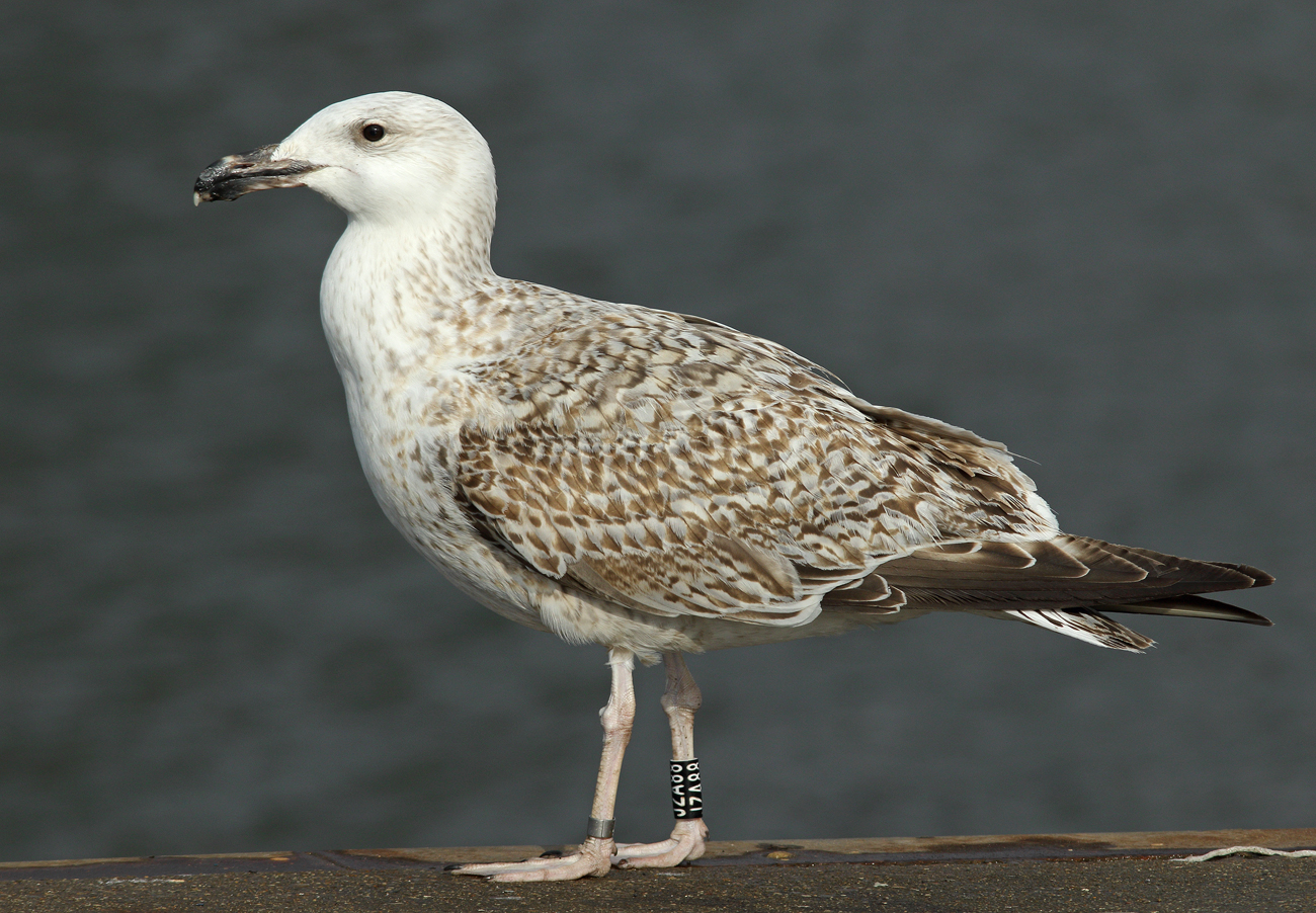 below: Great Black-backed Gull (Larus marinus) JZA88 1st cycle (2CY), March 21 2016, IJmuiden, the Netherlands.