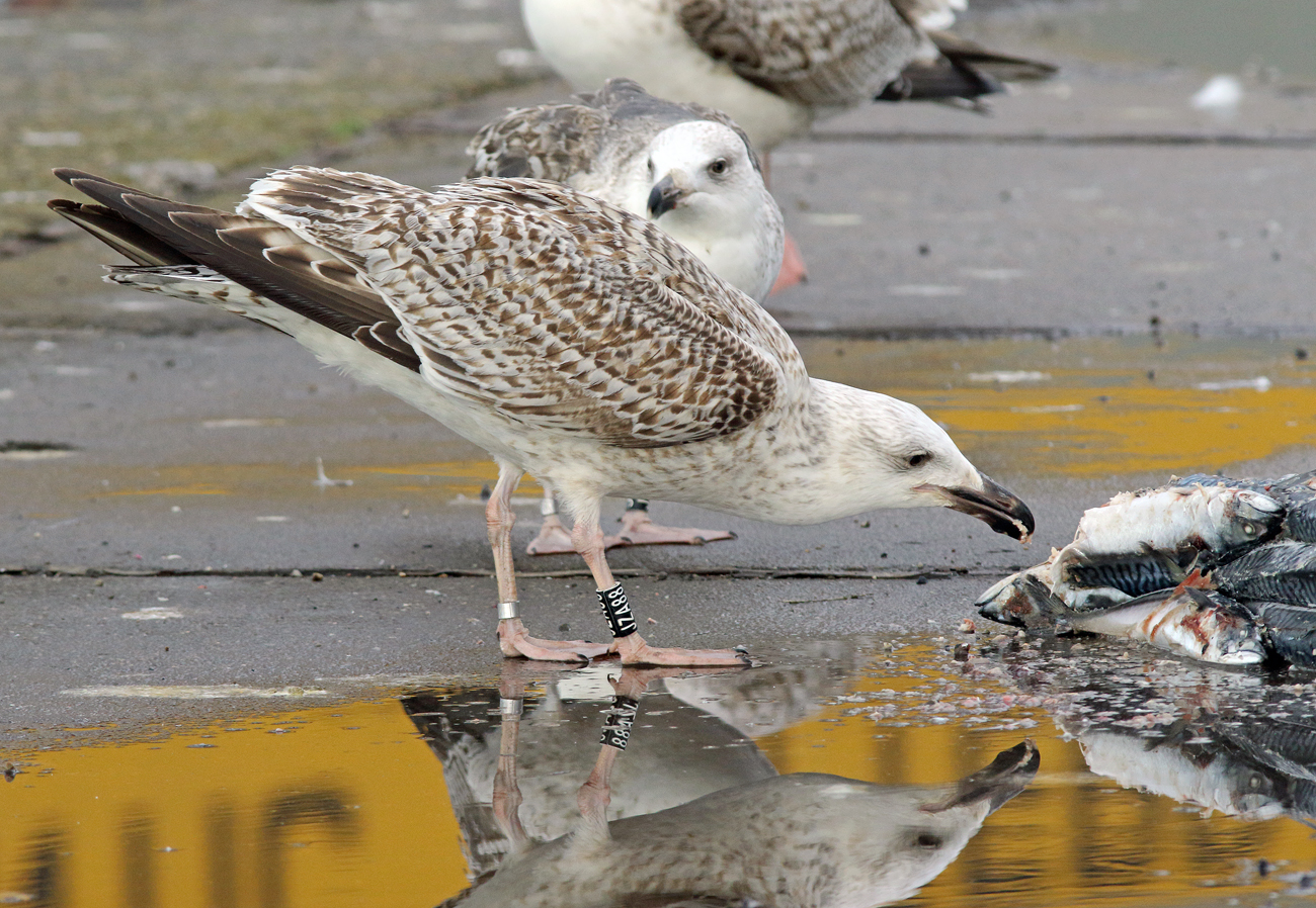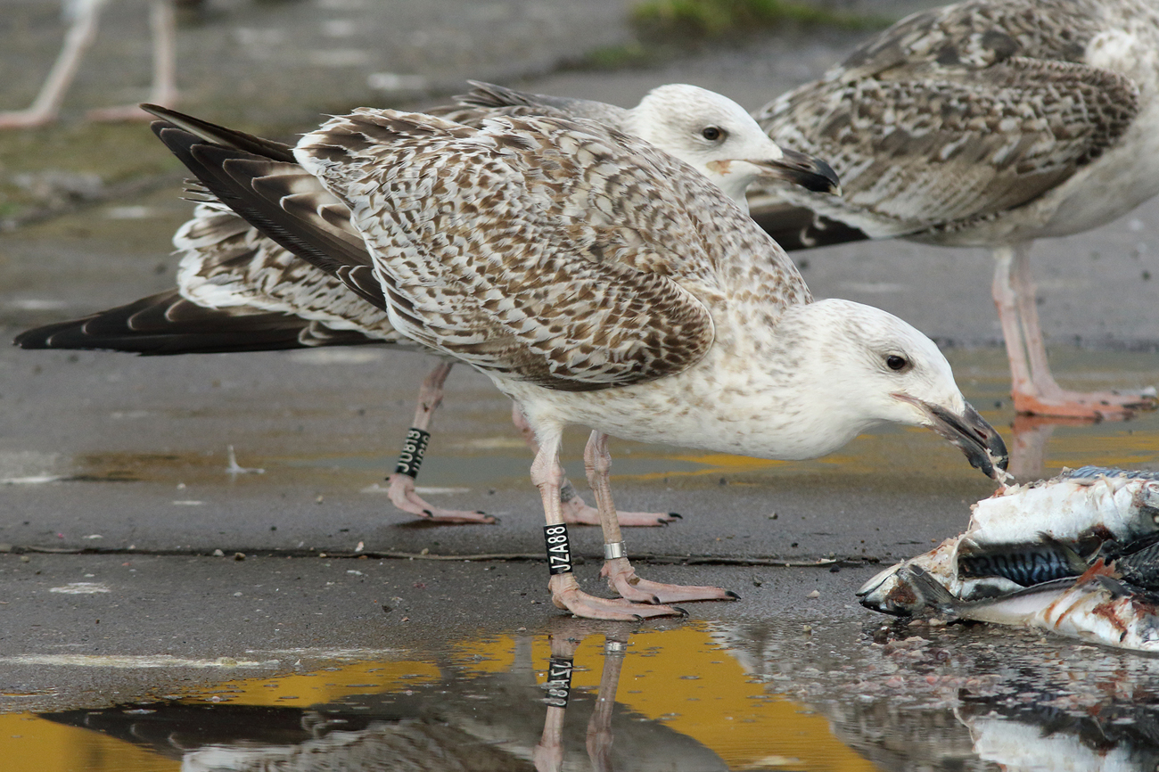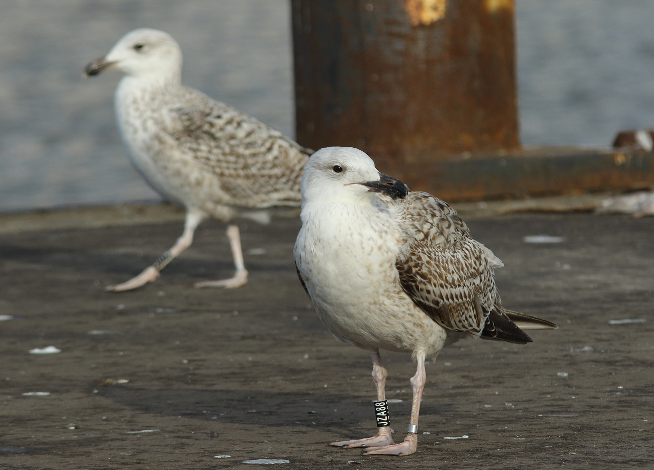 below: Great Black-backed Gull (Larus marinus) JZA88 1st cycle (2CY), February 19 2016, IJmuiden, the Netherlands.
