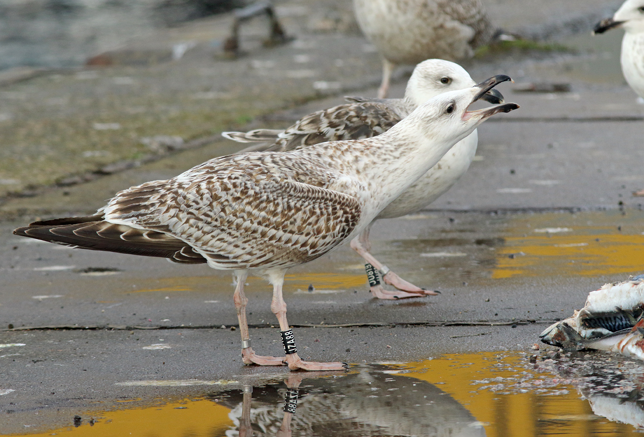 below: Great Black-backed Gull (Larus marinus) JZA88 1st cycle (2CY), February 24 2016, IJmuiden, the Netherlands.