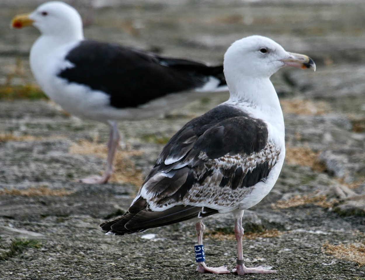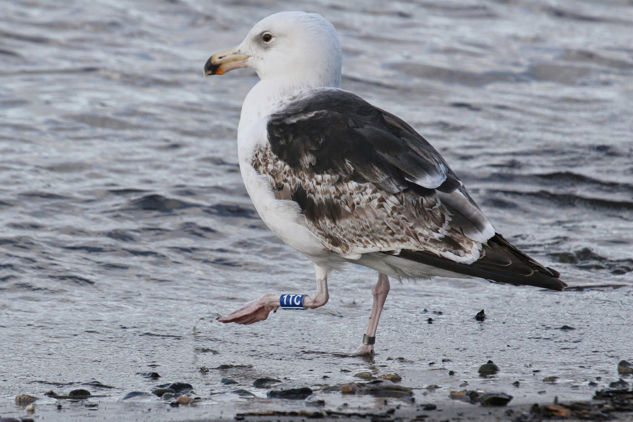 Great Black-backed Gull (Larus marinus) 1TC 3CY, June 09-20 2014, Bray Harbour, Ireland. Picture: Ronnie Martin.Visit Graham's blog! Ringed on island Irelands Eye, near Dublin, summer 2012 by Chris Honan. below: Great Black-backed Gull (Larus marinus) 1TC 3CY, June 20 2014, Bray Harbour, Ireland. Picture: Ronnie Martin. All visible primaries (P5-P10 still old), but note new blackish median coverts indicating complete moult is on its way (and probably this bird has new inner primaries at the moment). below: Great Black-backed Gull (Larus marinus) 1TC 3CY, June 09 2014, Bray Harbour, Ireland. Picture: Ronnie Martin. Complete moult started: new outer MC and new upper TT. below: island Irelands Eye, near Dublin. |