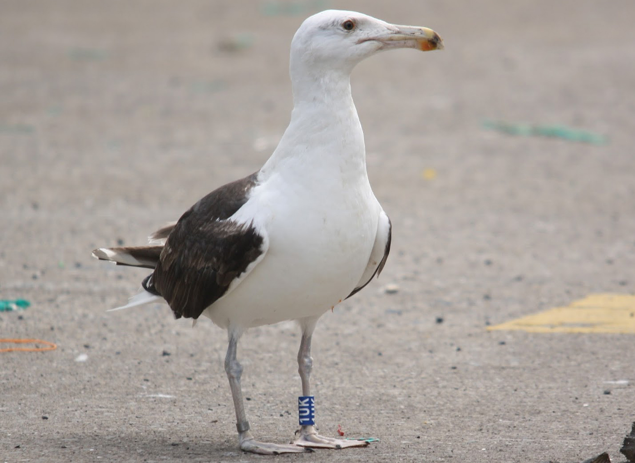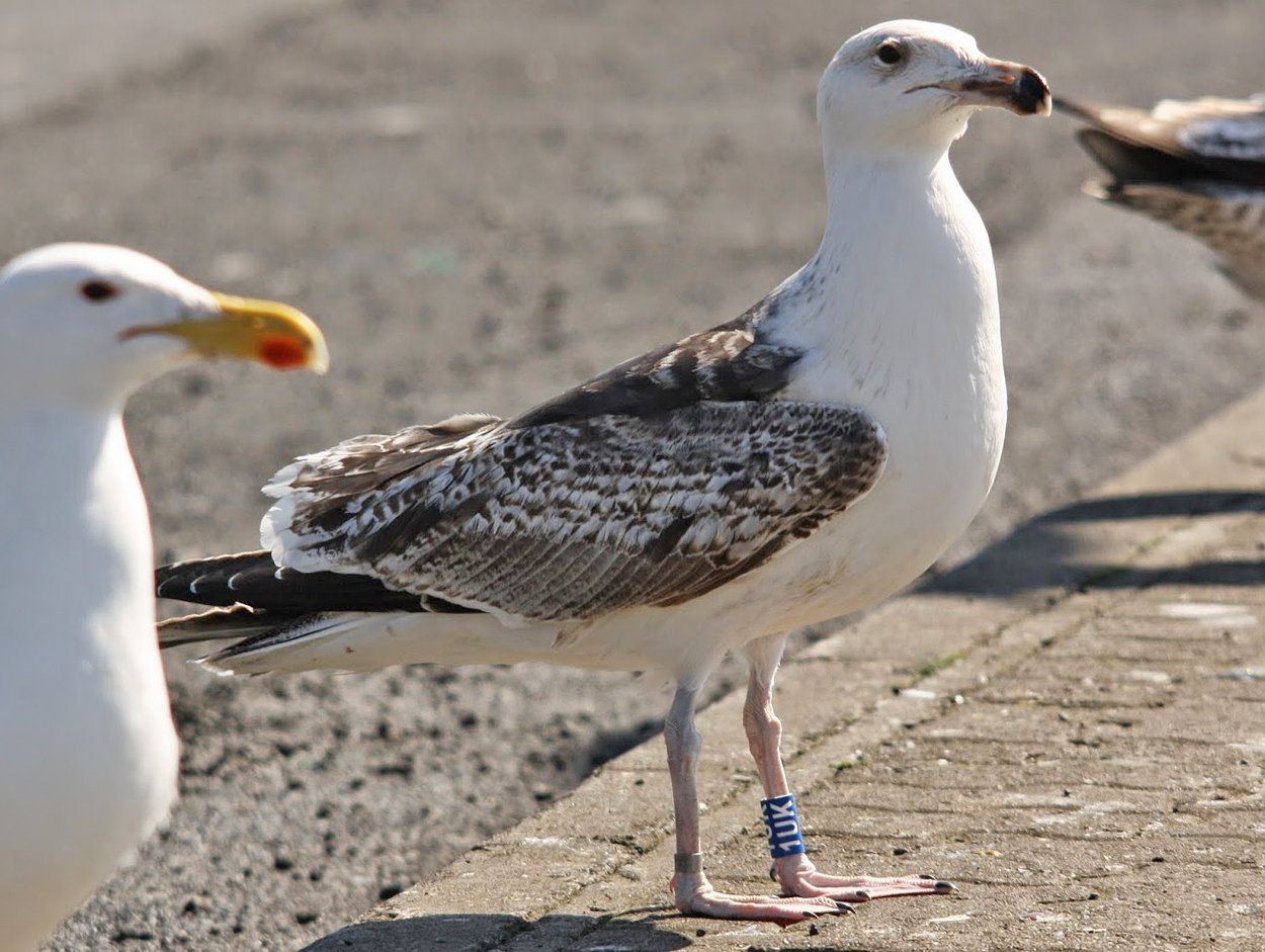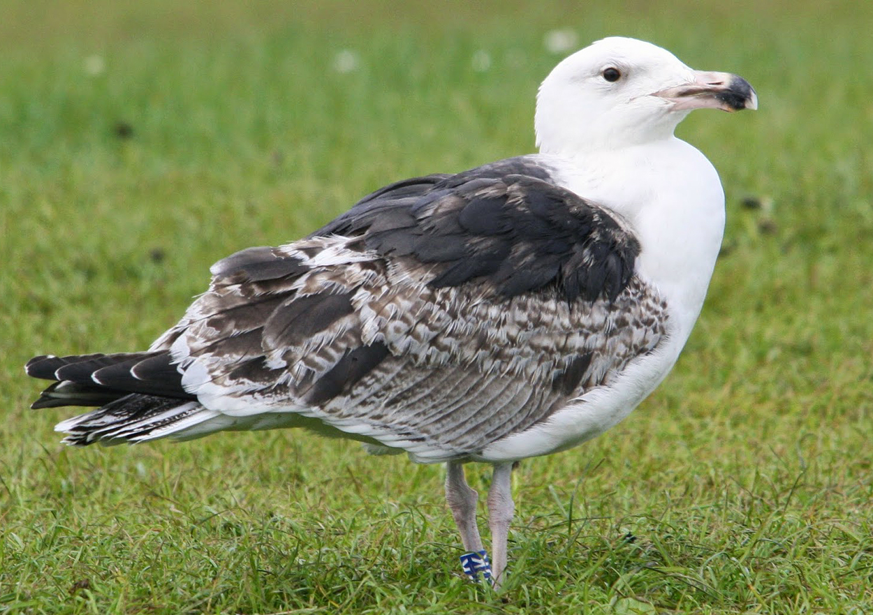 Great Black-backed Gull (Larus marinus) 1UK 3CY-4CY, April 2014 - July 2015, Howth, Ireland. Picture: Graham Prole.Ringed on island Irelands Eye, near Dublin, summer 2012. Visit Graham's blog! Great Black-backed Gull (Larus marinus) 1UK 4CY, July 05 2015, Howth Harbour, Ireland. Picture: Graham Prole. Great Black-backed Gull (Larus marinus) 1UK 4CY, April 09 2015, Howth Harbour, Ireland. Picture: Graham Prole. Broad band on bill and dark markings on underwing coverts. Some black in tail. P1-P10 old. Great Black-backed Gull (Larus marinus) 1UK 3CY, May 01 2014, Howth, Ireland. Picture: Graham Prole. Great Black-backed Gull (Larus marinus) 1UK 3CY, April 24 2014, Howth, Ireland. Picture: Graham Prole. below: island Irelands Eye, near Dublin. |