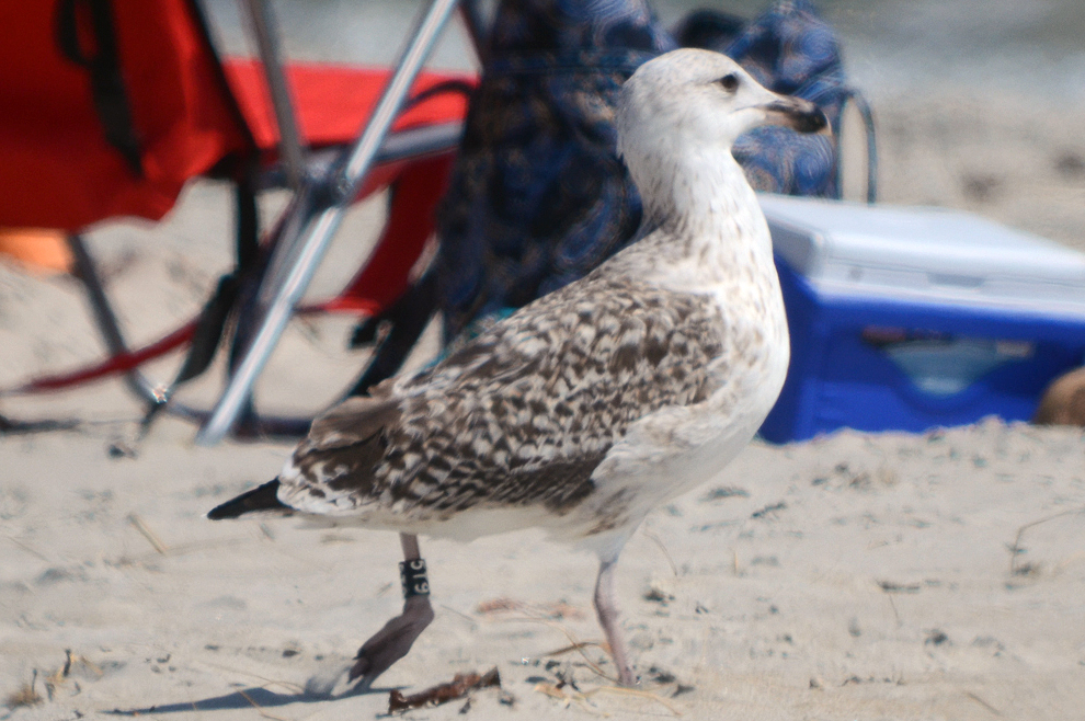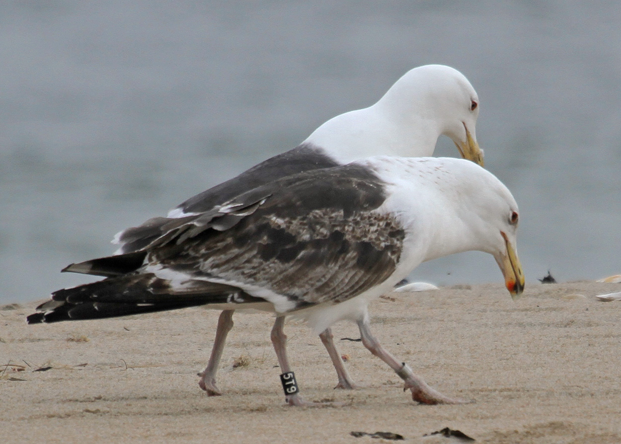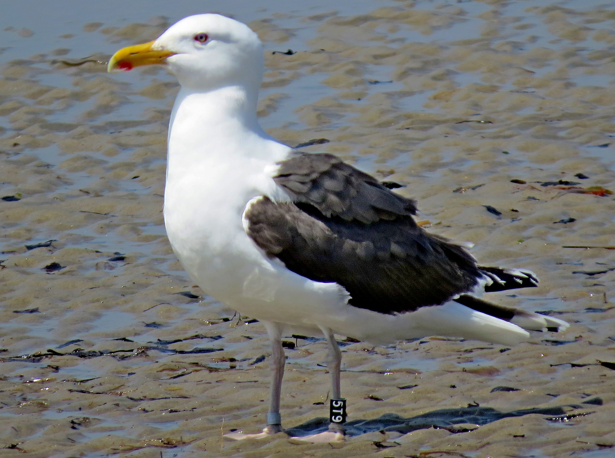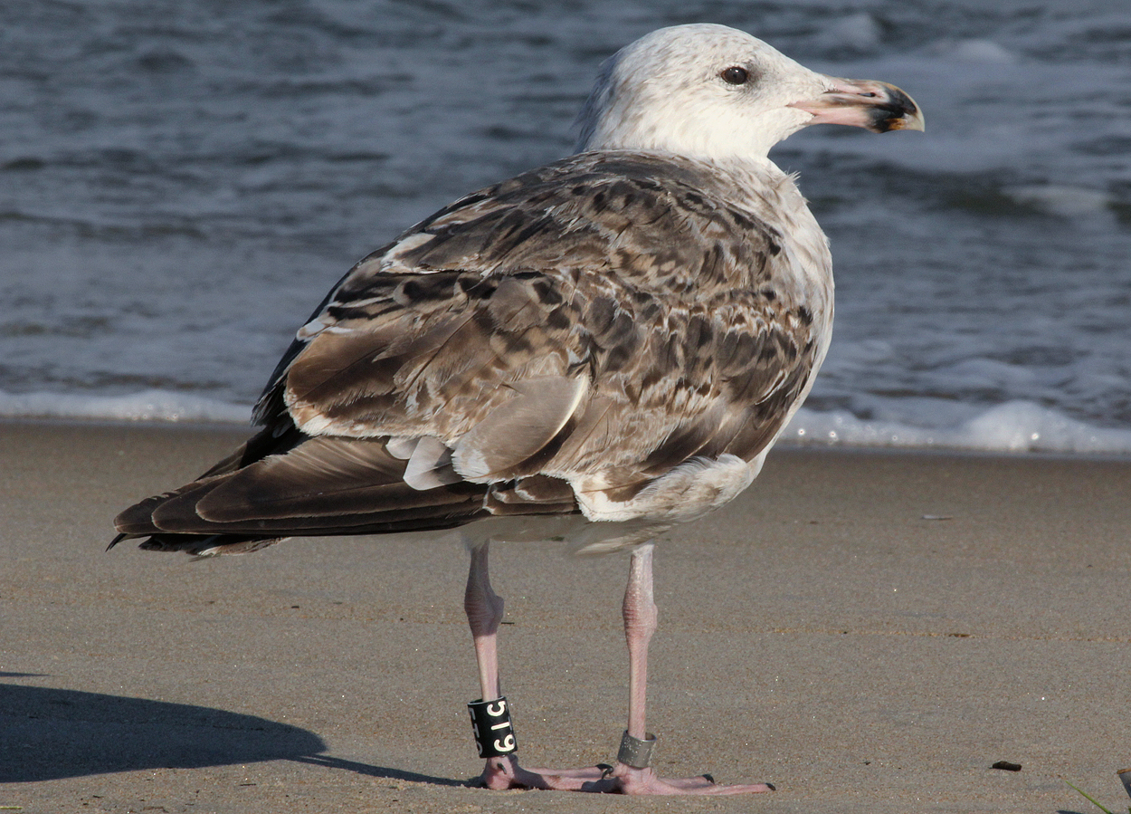 Great Black-backed Gull (Larus marinus) 5T9 1cy-5cy, August 2011 - July 2015, Sandy Point - Plum Island, Ipswich, MA.Banded as pullus on Appledore Island, Maine on July 12 2011. Visit Appledore's BLOG. A recent study used satellite data for Cory’s and Balearic shearwaters to analyze their movement patterns during foraging trips. In general, foraging trips lasted less than two days and covered distances anywhere from 10 to 1,000 kilometers. On days when local fisheries were not operating, the birds combined local searching with searching over very large distances. This “multi-scale” search pattern is efficient when the birds are looking for their natural prey, small fish and squid, which are highly mobile and unpredictably distributed in space and time. In contrast, on days when fishermen were discarding fish, the birds performed more limited, local searches focused around the boats. Thus, fishery activities dramatically altered foraging patterns of these pelagic seabird species. So, the next time you hear someone “trash talking” (so to speak) gulls for their scavenging ways, you can direct them to our friends the shearwaters! below: Great Black-backed Gull (Larus marinus) 5T9 4th cycle (5CY), July 07 2015, Sandy Point Reservation - Plum Island, Ipswich, MA. Picture: Billy Clifford. Each report of a banded gull has significance for the Gulls of Appledore research team. Some well-known gulls frequent the Plum Island/Parker River NWR/Sandy Point area of Massachusetts. 5T9 is a frequent visitor at Sandy Point/Plum Island, and was also reported and photographed by Clifford on July 7, 2015. Dave Adrien also recently reported 5T9 on July 3, 2015 at Sandy Point. below: Great Black-backed Gull (Larus marinus) 5T9 4th cycle (5CY), May 28 2015, Sandy Point Reservation - Plum Island, Ipswich, MA. Picture: Dan Prima. Adult-like bird with brown hue on some of the coverts. Pale iris. In display. below: Great Black-backed Gull (Larus marinus) 5T9 3cy, June 29 2013, Sandy Point Beach - Plum Island. Picture Stef Pav. below: Great Black-backed Gull (Larus marinus) 5T9 2cy, September 01 2012, Sandy Point Beach - Plum Island. Picture: Suzanne Sullivan. P7 fully grown, no old primaries left. below: Great Black-backed Gull (Larus marinus) 5T9 2cy, August 26 2012, Sandy Point Beach - Plum Island. Picture: Steve Arena. P7 fully grown, no old primaries left. below: Great Black-backed Gull (Larus marinus) 5T9 2cy, July 04 2012, Sandy Point Beach - Plum Island. Picture: Suzanne Sullivan. 1st PB moult. P8-P10 old juvenile, P1-P5 replaced. P6-P7 growing. below: Great Black-backed Gull (Larus marinus) 5T9 1cy, August 27 2011, Sandy Point Beach - Plum Island. Picture: Suzanne Sullivan. Completely juvenile plumage. |