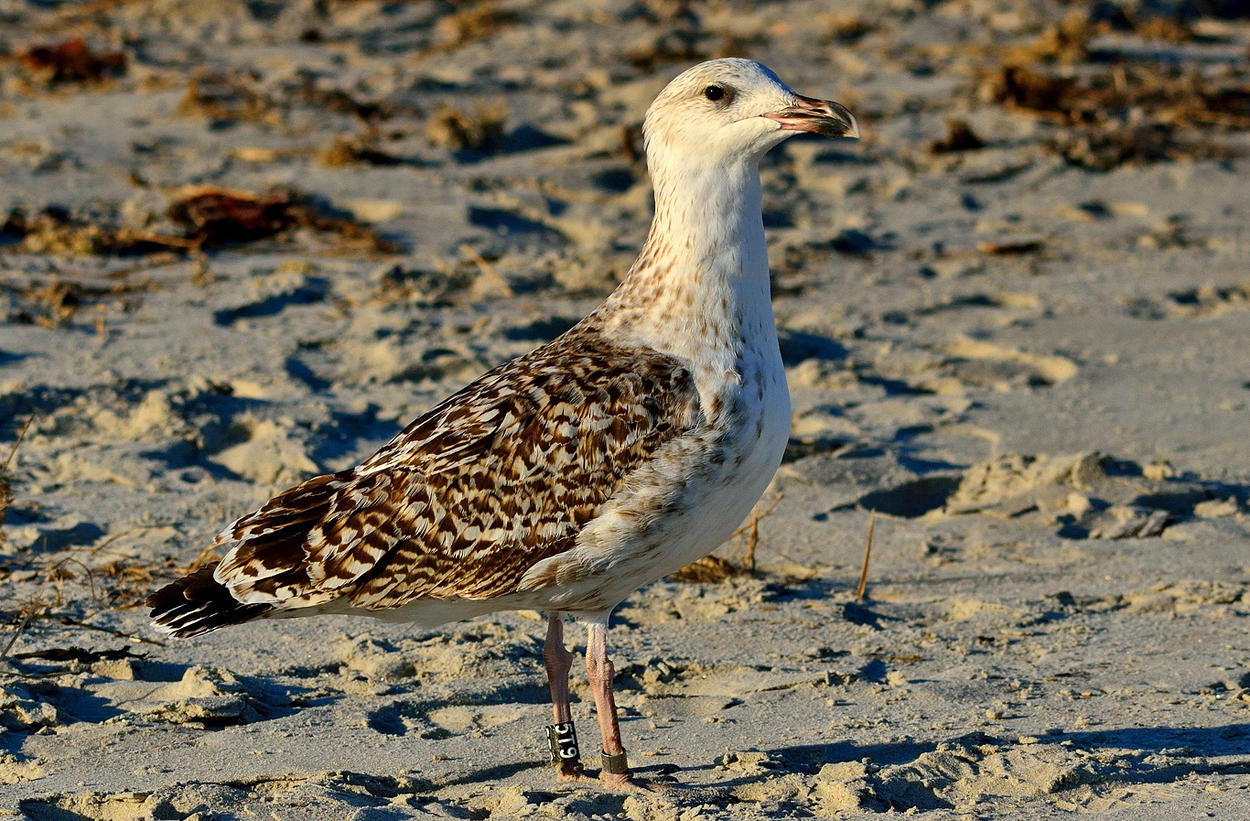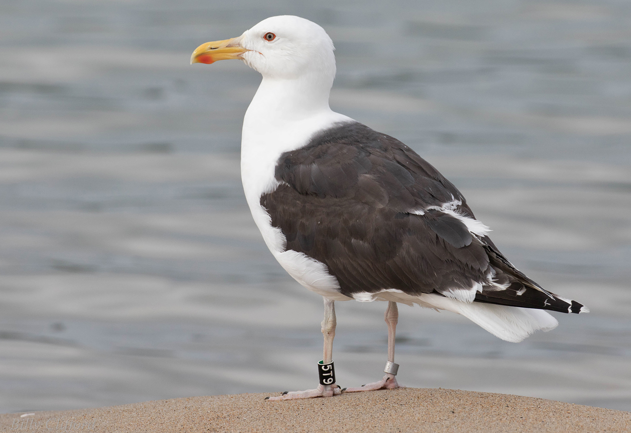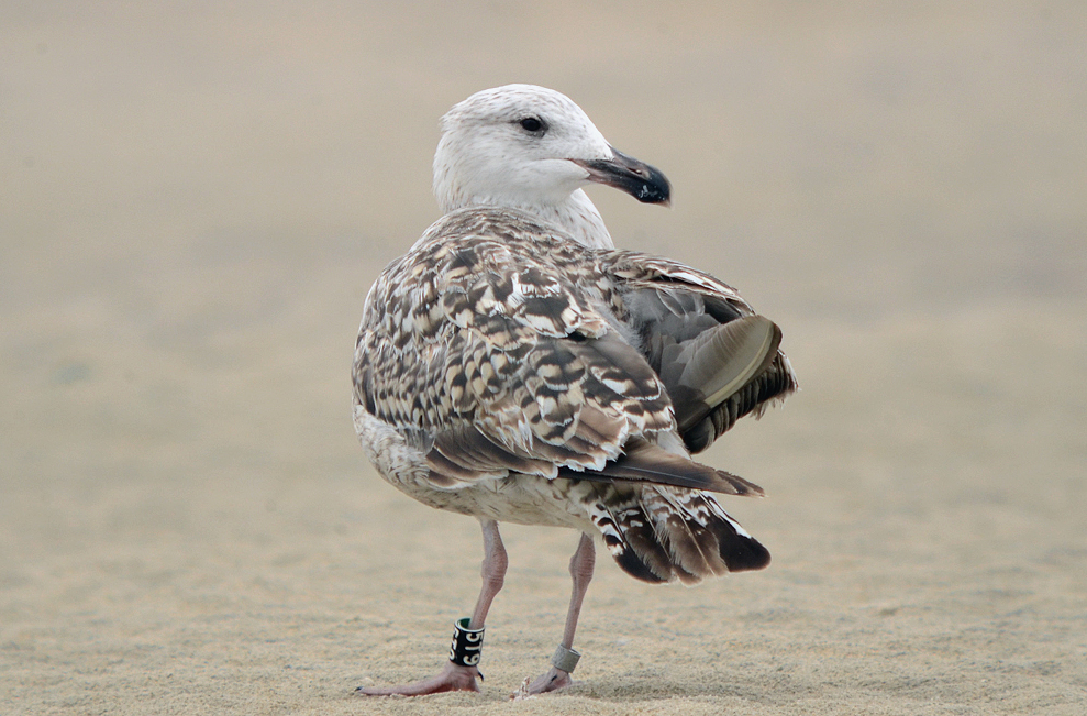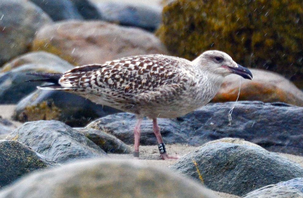 Great Black-backed Gull (Larus marinus) 5T9 1cy-5cy, August 2011 - July 2015, Sandy Point - Plum Island, Ipswich, MA.Banded as pullus on Appledore Island, Maine on July 12 2011. Visit Appledore's BLOG. A recent study used satellite data for Cory’s and Balearic shearwaters to analyze their movement patterns during foraging trips. In general, foraging trips lasted less than two days and covered distances anywhere from 10 to 1,000 kilometers. On days when local fisheries were not operating, the birds combined local searching with searching over very large distances. This “multi-scale” search pattern is efficient when the birds are looking for their natural prey, small fish and squid, which are highly mobile and unpredictably distributed in space and time. In contrast, on days when fishermen were discarding fish, the birds performed more limited, local searches focused around the boats. Thus, fishery activities dramatically altered foraging patterns of these pelagic seabird species. So, the next time you hear someone “trash talking” (so to speak) gulls for their scavenging ways, you can direct them to our friends the shearwaters! below: Great Black-backed Gull (Larus marinus) 5T9 4th cycle (5CY), July 07 2015, Sandy Point Reservation - Plum Island, Ipswich, MA. Picture: Billy Clifford. Each report of a banded gull has significance for the Gulls of Appledore research team. Some well-known gulls frequent the Plum Island/Parker River NWR/Sandy Point area of Massachusetts. 5T9 is a frequent visitor at Sandy Point/Plum Island, and was also reported and photographed by Clifford on July 7, 2015. Dave Adrien also recently reported 5T9 on July 3, 2015 at Sandy Point. below: Great Black-backed Gull (Larus marinus) 5T9 4th cycle (5CY), May 28 2015, Sandy Point Reservation - Plum Island, Ipswich, MA. Picture: Dan Prima. Adult-like bird with brown hue on some of the coverts. Pale iris. In display. below: Great Black-backed Gull (Larus marinus) 5T9 3cy, June 29 2013, Sandy Point Beach - Plum Island. Picture Stef Pav. below: Great Black-backed Gull (Larus marinus) 5T9 2cy, September 01 2012, Sandy Point Beach - Plum Island. Picture: Suzanne Sullivan. P7 fully grown, no old primaries left. below: Great Black-backed Gull (Larus marinus) 5T9 2cy, August 26 2012, Sandy Point Beach - Plum Island. Picture: Steve Arena. P7 fully grown, no old primaries left. below: Great Black-backed Gull (Larus marinus) 5T9 2cy, July 04 2012, Sandy Point Beach - Plum Island. Picture: Suzanne Sullivan. 1st PB moult. P8-P10 old juvenile, P1-P5 replaced. P6-P7 growing. below: Great Black-backed Gull (Larus marinus) 5T9 1cy, August 27 2011, Sandy Point Beach - Plum Island. Picture: Suzanne Sullivan. Completely juvenile plumage. |