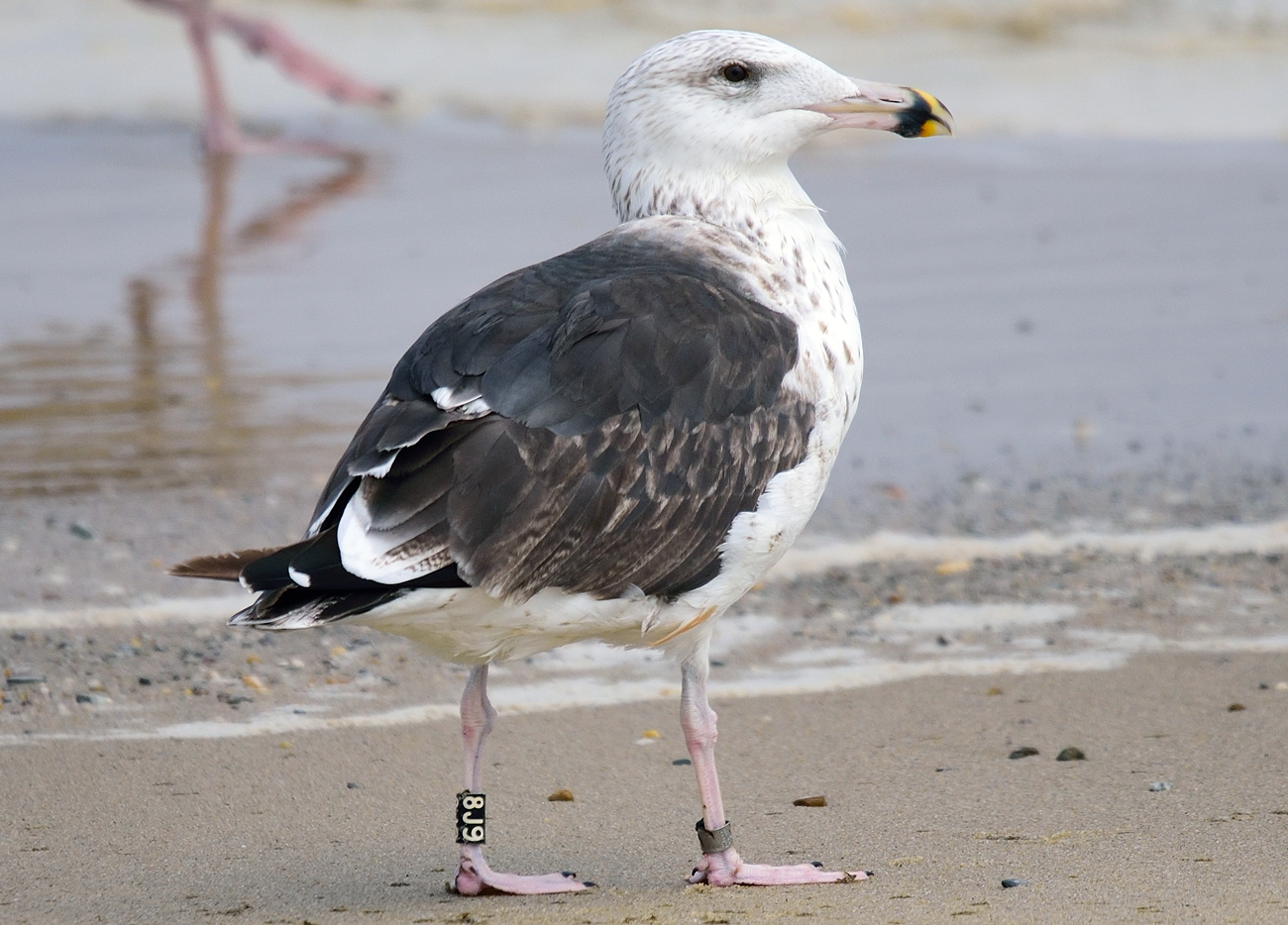 Great Black-backed Gull (L. marinus) 8J9 3rd pre-basic moult (3CY), September 04 2015, High Head, North Truro, Barnstable County, Massachusetts. Picture: Steve Arena.Please visit Steve's Flick photostream excellent website for many more images! Banded as pullus on July 12 2013, at Appledore Island, York County, Maine USA. For more info about this project, see The Gulls Of Appledore blog. Last stage of complete moult: P10 old 2nd gen primary, P1-P7 new 3rd gen primaries. New 3rd gen tail. |