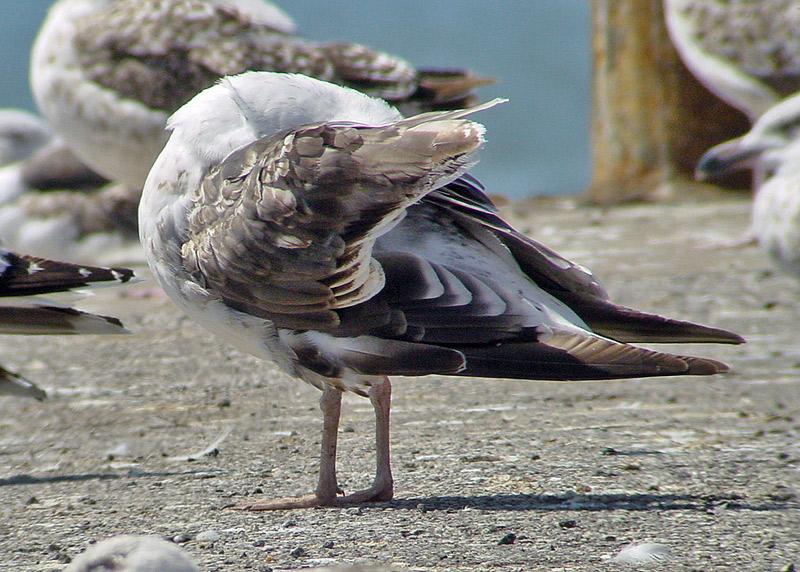 Great Black-backed Gull (Larus marinus) 3cy, July 11 2002, Le Portel - Boulogne sur Mer, France (50.42 N - 01.34 E).Primary moult stage: p7 missing but the print of the primary is clearly visible on p8. Moult in the rectrices has started with the outer tail-feather left already third generation. A few central feathers are missing and the other are still old second generation. The top image clearly shows the fifth primary which is fully grown. The secondaries are visible beneath the greater coverts: They are still very immature, with a brown centre and a broad white fringe. These second generation secondaries differ strongly from the grey more adult-like third generation feathers. |