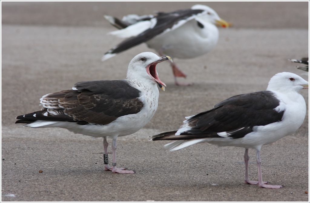 Great Black-backed Gull (Larus marinus) JE539 3cy, September 11 2011, Boulogne sur Mer, France (50.44 N - 01.35 E). Picture Jean-Michel Sauvage.Bird ringed as pullus in Storøytåa, Mandal, Vest-Agder, Norway (57°59'18"N 007°26'10"E), ringed on June 30 2009. 30.06 2009 Storøytåa, Mandal, Vest-Agder, Norway 57°59'18"N 007°26'10"E P8 fully grown. Upper tertial shed again, start of the partial autumn moult. |