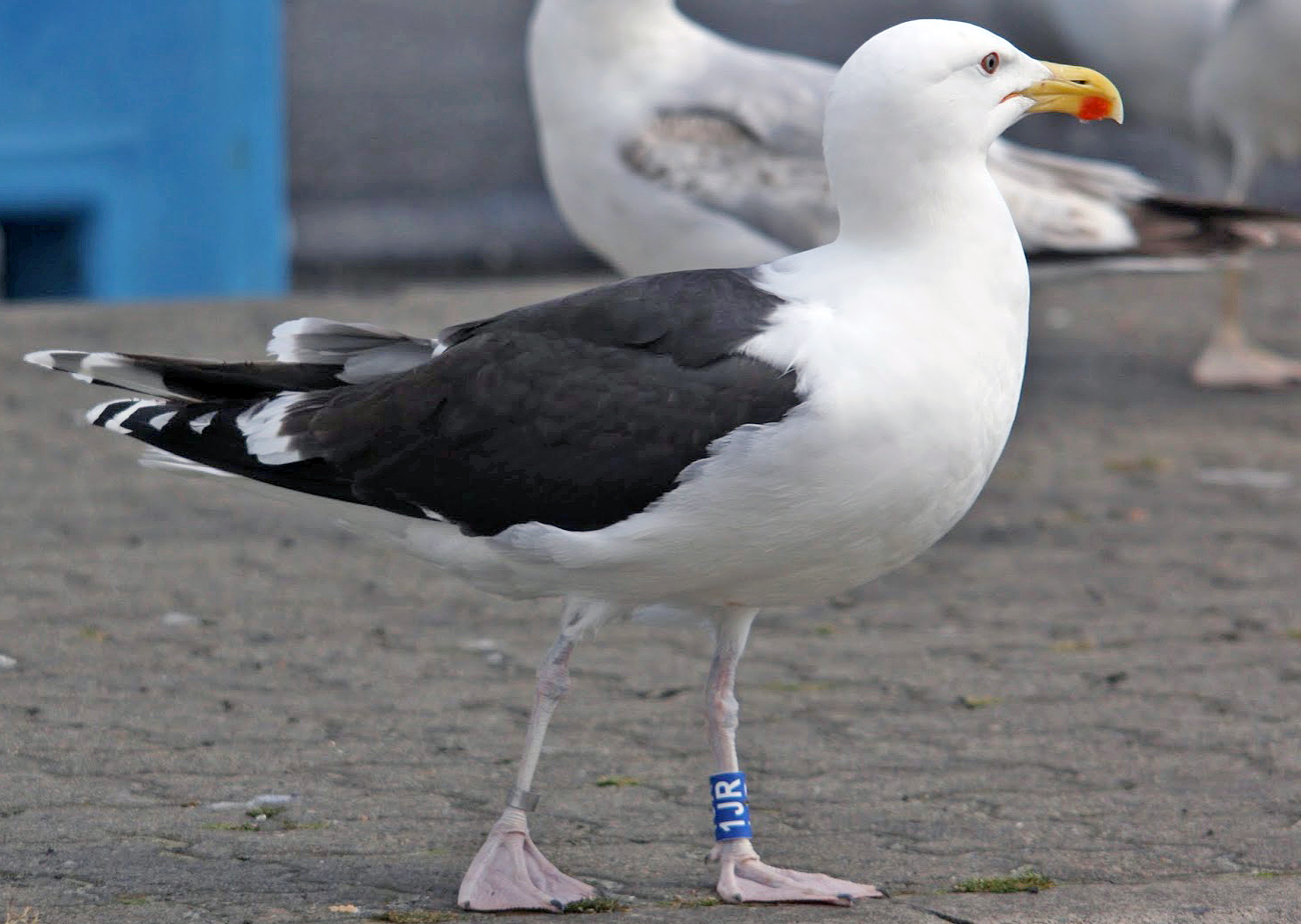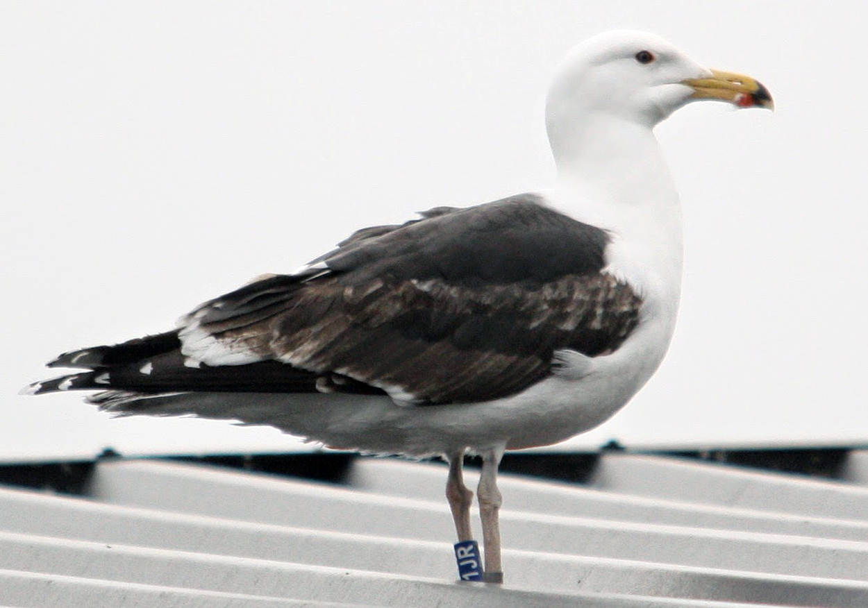 Great Black-backed Gull (Larus marinus) 1JR 4CY-5CY, May 2014 & July 2015, Bullock Harbour, Ireland. Picture: Graham Prole.Ringed on island Irelands Eye, near Dublin, summer 2011. Probably male. Visit Graham's blog! Below: Great Black-backed Gull (Larus marinus) 1JR 4CY, May 03 2014, Bullock Harbour, Ireland. Picture: Graham Prole.Complete moult started: missing outer MC. Below: Great Black-backed Gull (Larus marinus) 1JR 5CY, July 05 0215, Howth Harbour, Ireland. Picture: Graham Prole.P5-P10 still old. below: island Irelands Eye, near Dublin. |