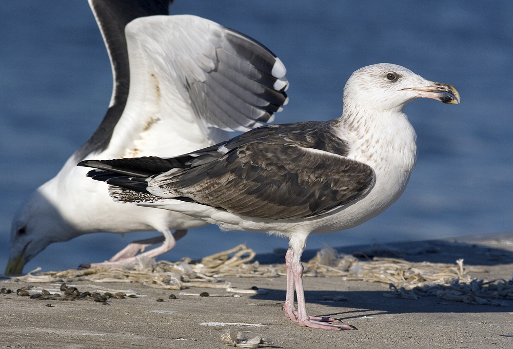 Great Black-backed Gull (Larus marinus) 4cy: February 02 2012, IJmuiden, the Netherlands.Scapular region appears as greyish black saddle, but with several immature patterned feathers in this bird. Several median coverts adult-like as well. 3rd gen primaries with white tips and large miror on P10. |