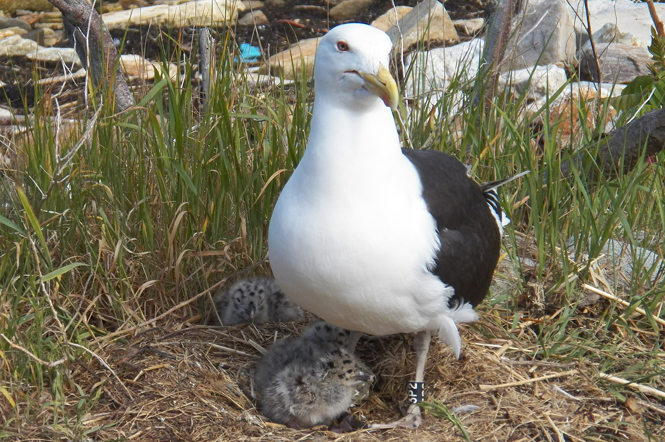 Great Black-backed Gull (Larus marinus) 3P2 adult, May 30 2015, Appledore Island, MA. Picture: Appledore banding team.3P2, banded on Appledore Island, Maine. Visit Appledore's BLOG. The “Gulls of Appledore” banding team is concluding a busy and productive week at Shoals Marine Lab on Appledore Island. Field readable bands were placed on more than 50 gulls, both Herring Gulls and Great-Black-backed Gulls. More than 500 sightings of banded gulls from prior years were recorded on Appledore Insland. Students learned first-hand about field work and the challenge of proper recording, flagging nests, and record keeping. They also learned that catching gulls is hard work requiring patience, care and ingenuity. Student volunteers were from Virginia, Massachusetts, New Hampshire, New York and Maine. |