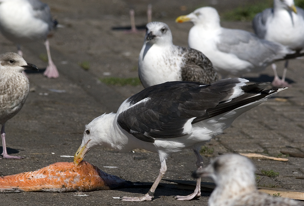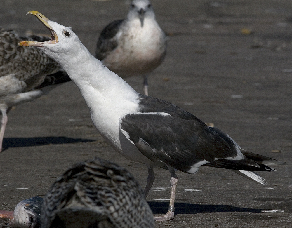 Great Black-backed Gull 10cy NLA 7.103.224 (Larus marinus) August 29 2012, IJmuiden, the Netherlands (52.27N - 04.33E).Ringed as 4cy, September 2006 at IJmuiden, after taken into care; now 10cy. Primary P4 is fully grown while P7-P10 still have to be shed. |