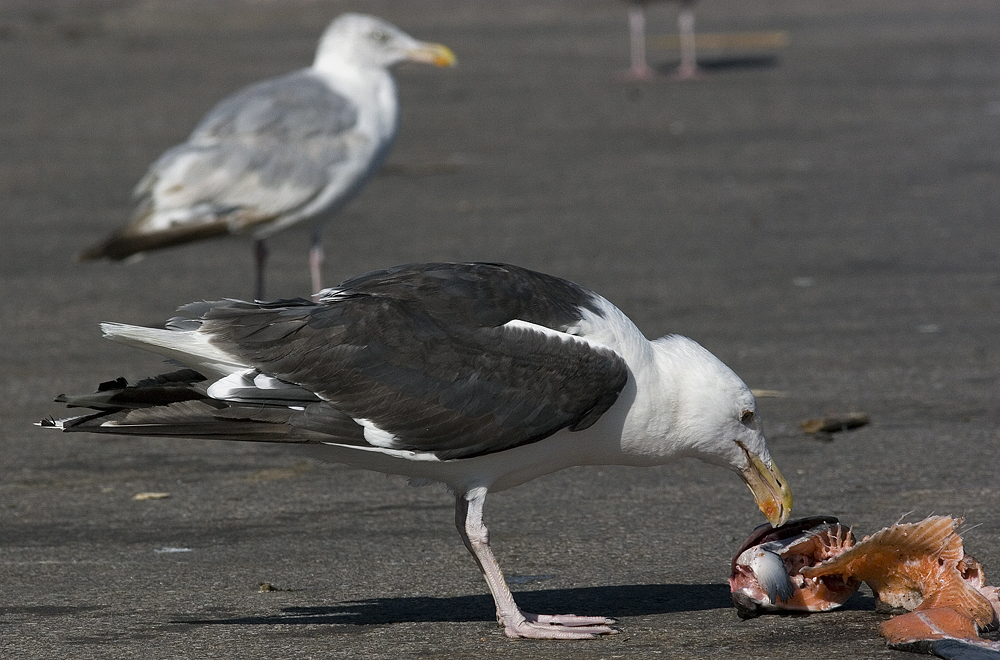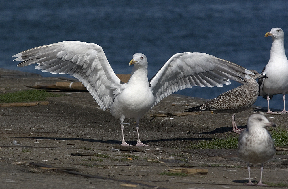 Great Black-backed Gull adult (Larus marinus) August 29 2012, IJmuiden, the Netherlands (52.27N - 04.33E).Active complete moult, P5 fully grown (in our notation P5 is fully grown once it exceeds P4 in length, which is just the case in this individual), P8-P10 old. Small mirror on P8. |